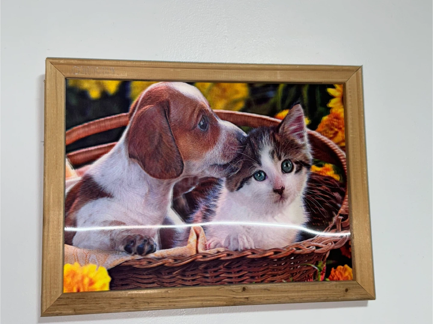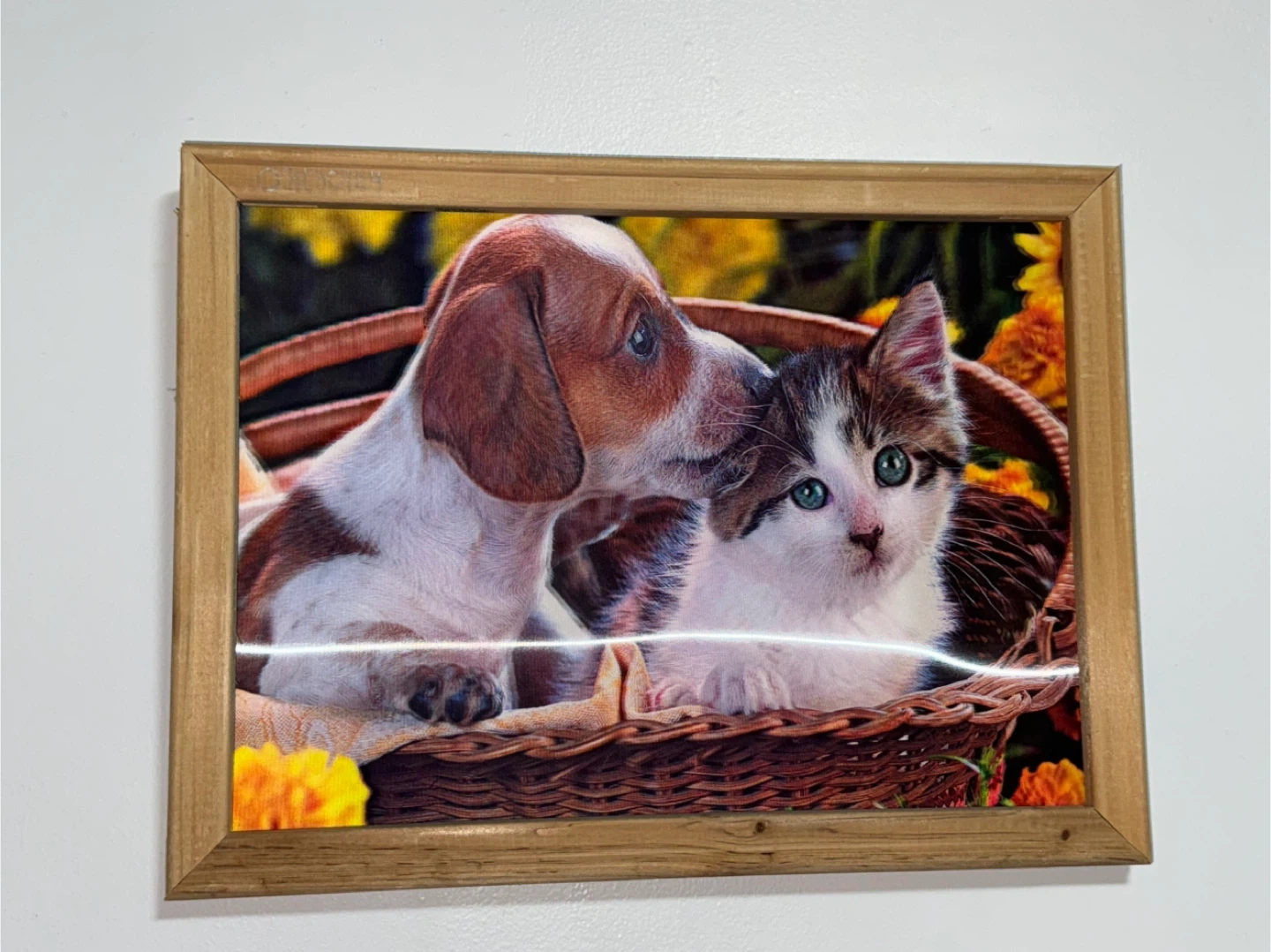 Este cuadro enmarcado representa una dulce escena de un cachorro acariciando suavemente con el hocico a un gatito dentro de una cesta. El marco está hecho de madera natural, lo que complementa los colores cálidos de la obra. ¡Es una pieza encantadora que añade un toque de calidez a cualquier habitación!