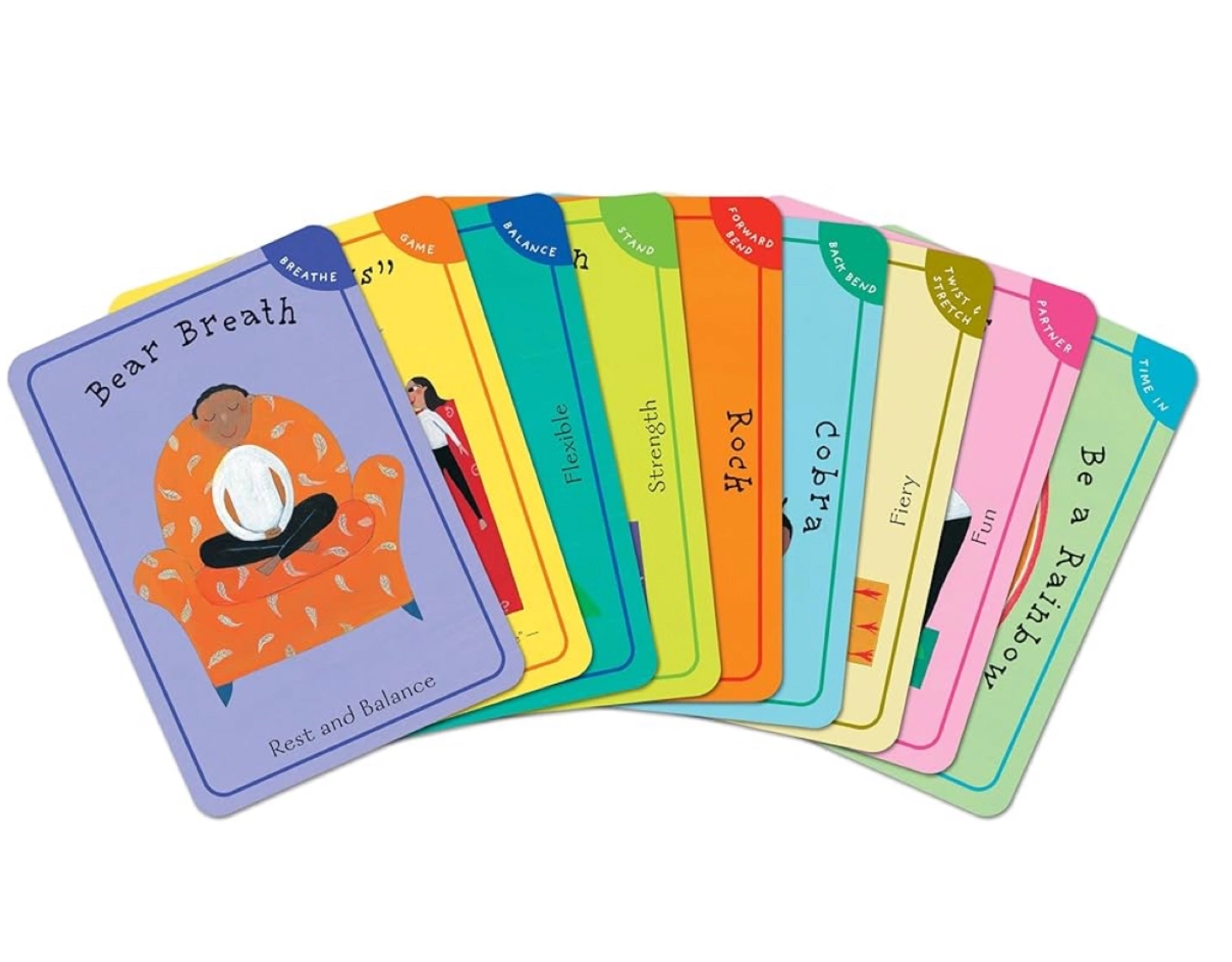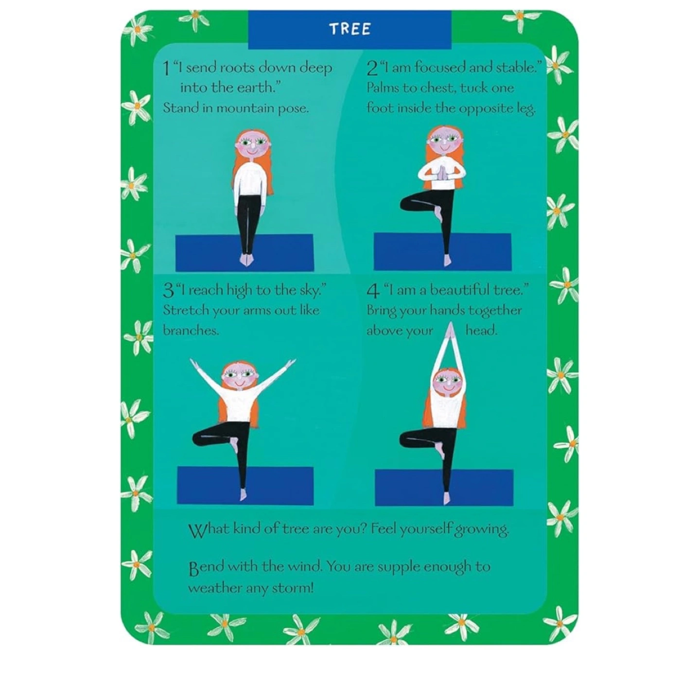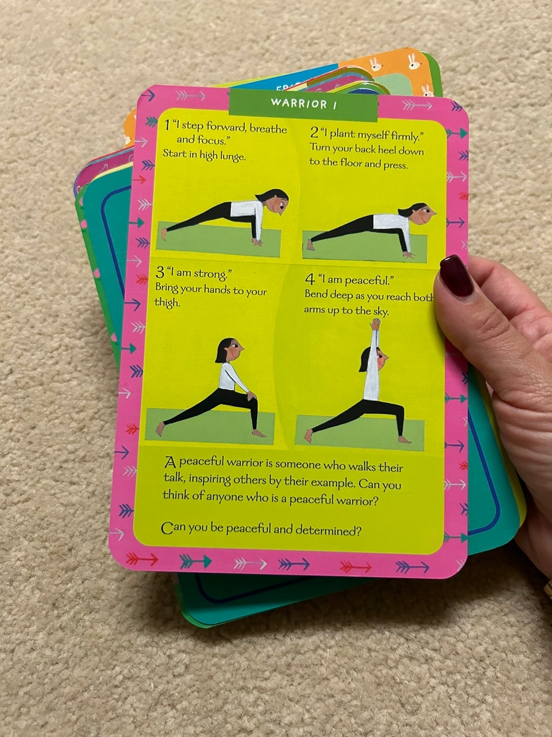 Deck of cards with illustrated yoga poses and activities for kids and adults. Includes instructions for each pose. Great for family fun.