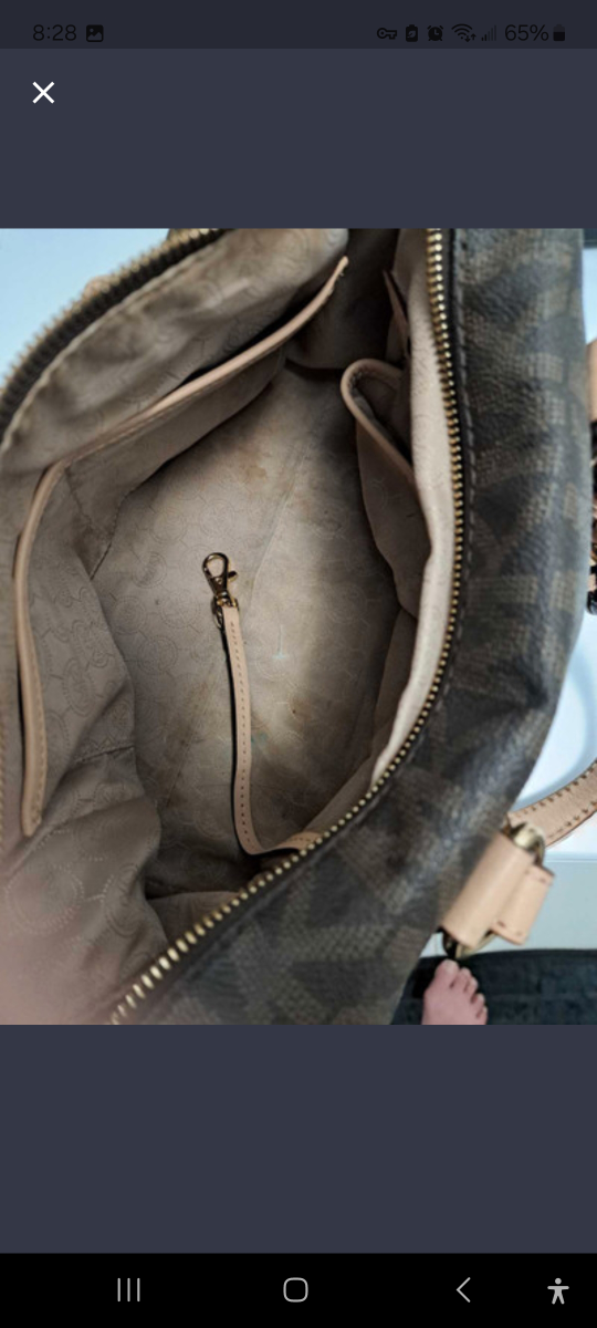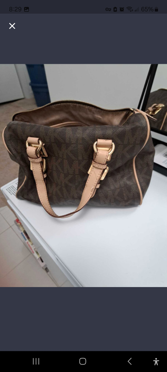Brown and beige signature handbag with gold hardware. Includes a dust bag. Has some wear and tear on the leather, but in good condition.
