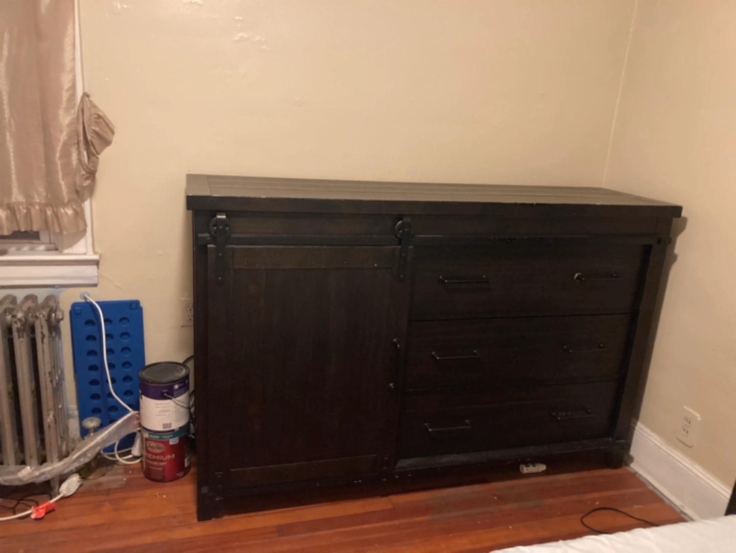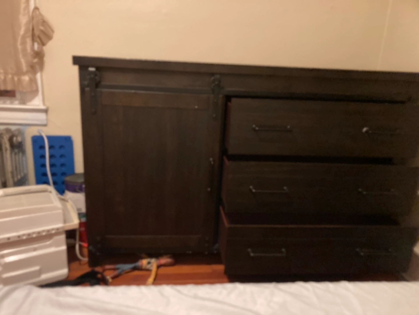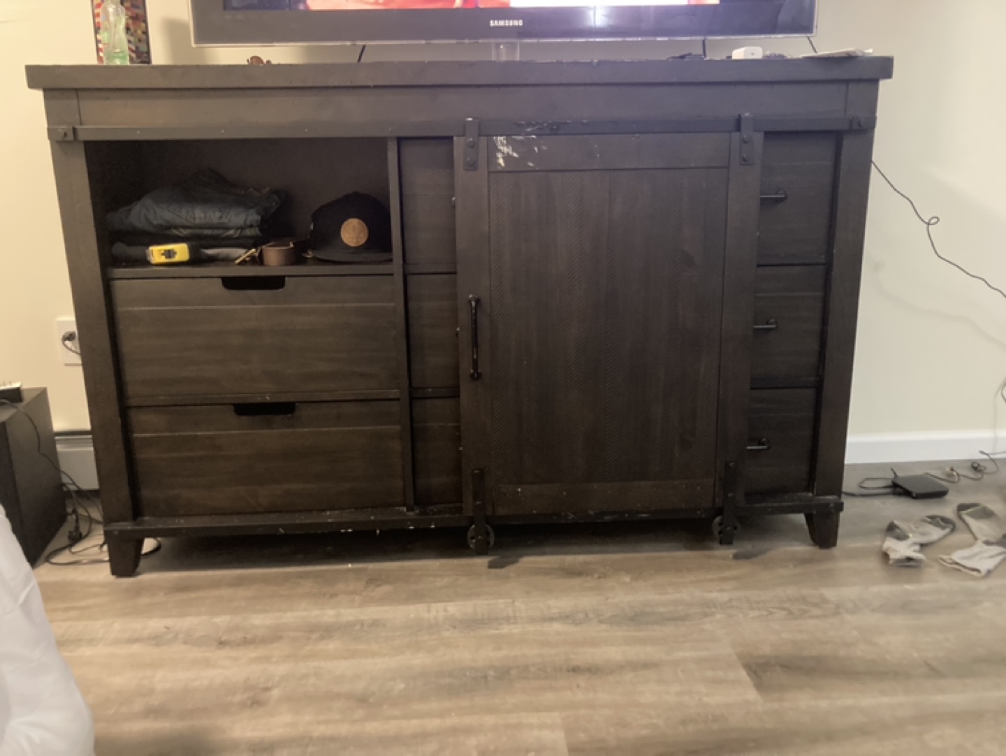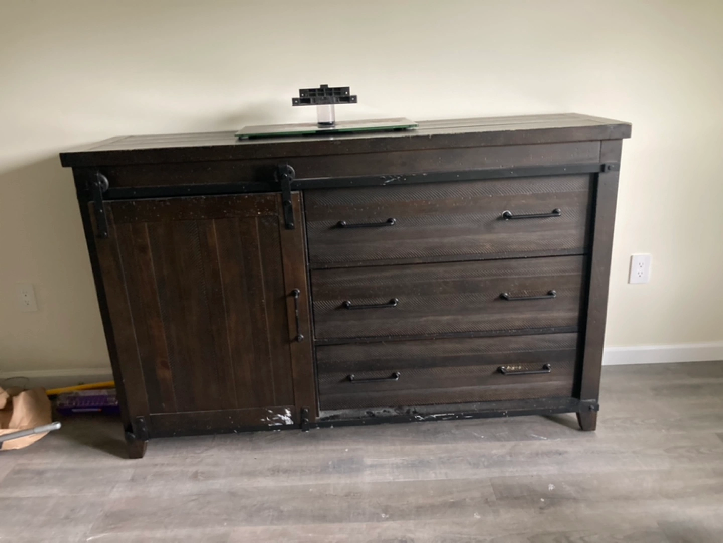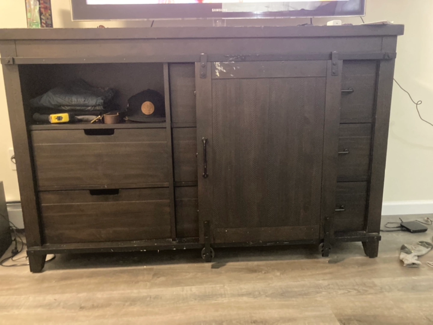 Dark brown dresser with three drawers and a sliding barn door. One shelf behind the door. Some minor wear and tear on the top.