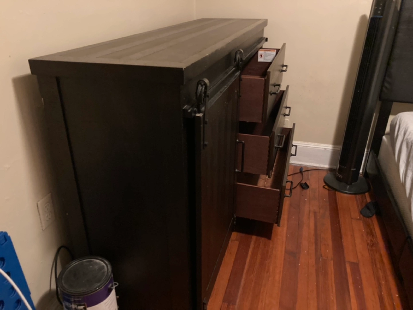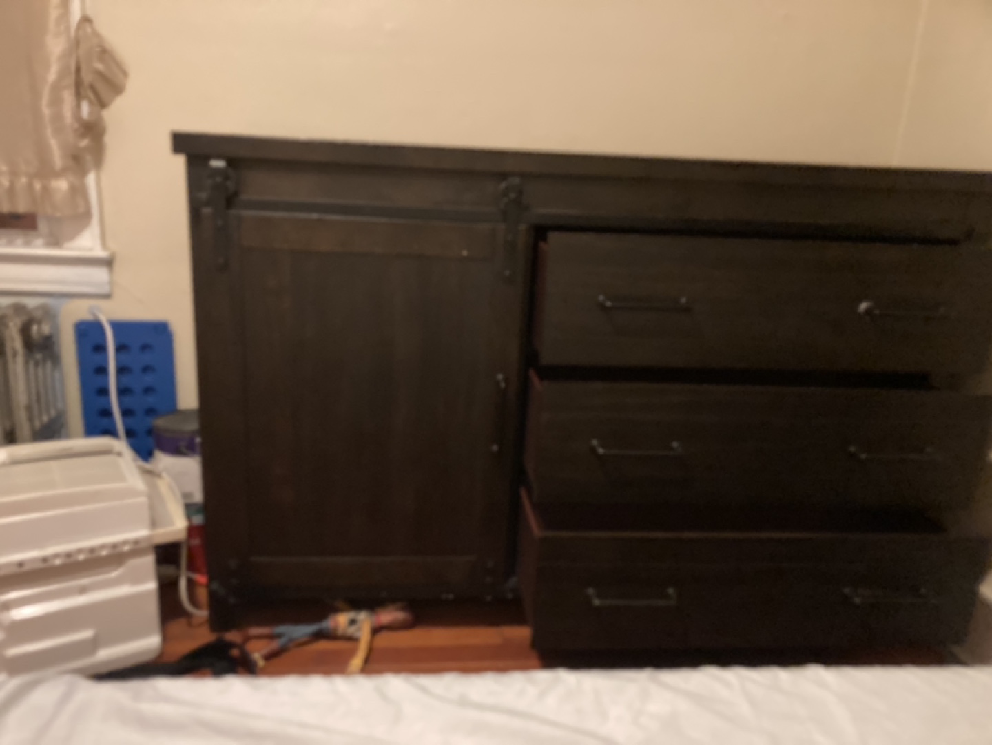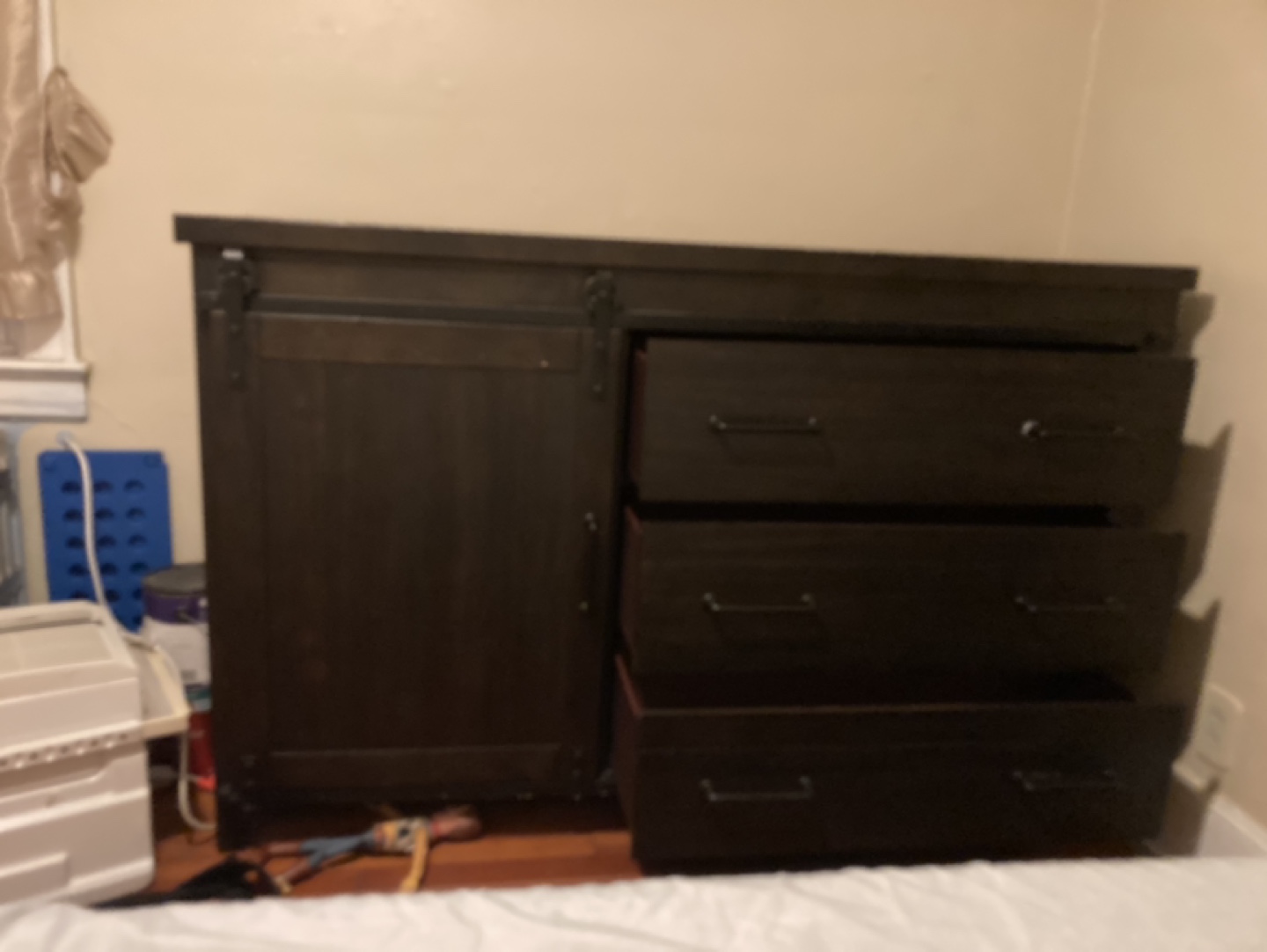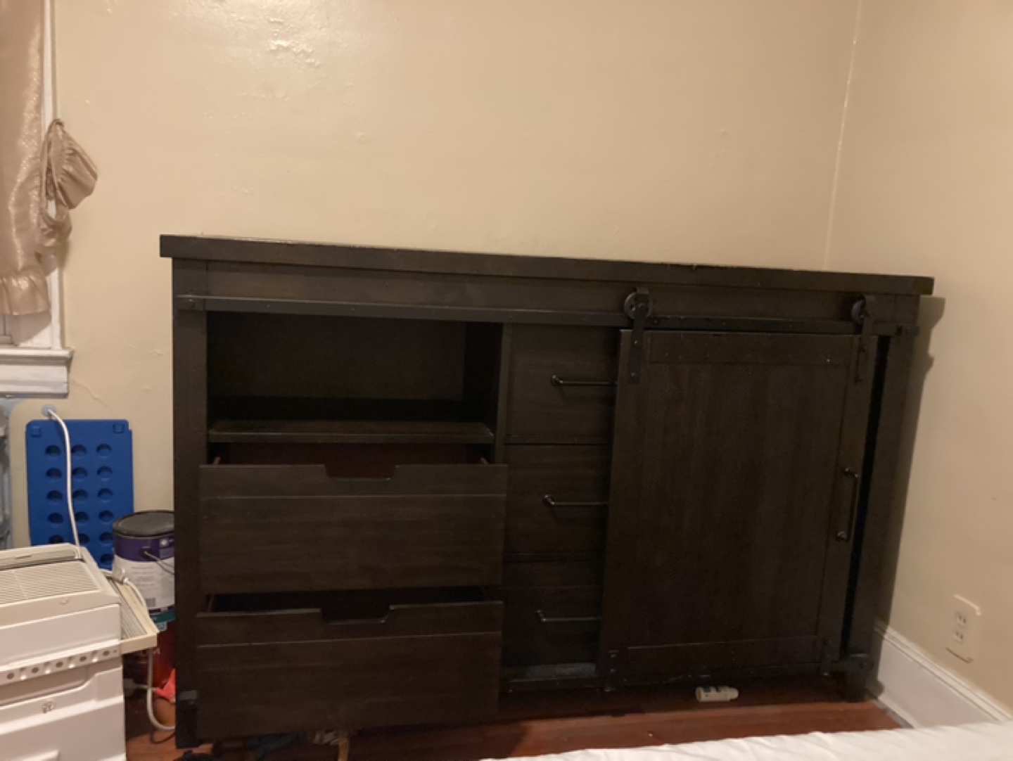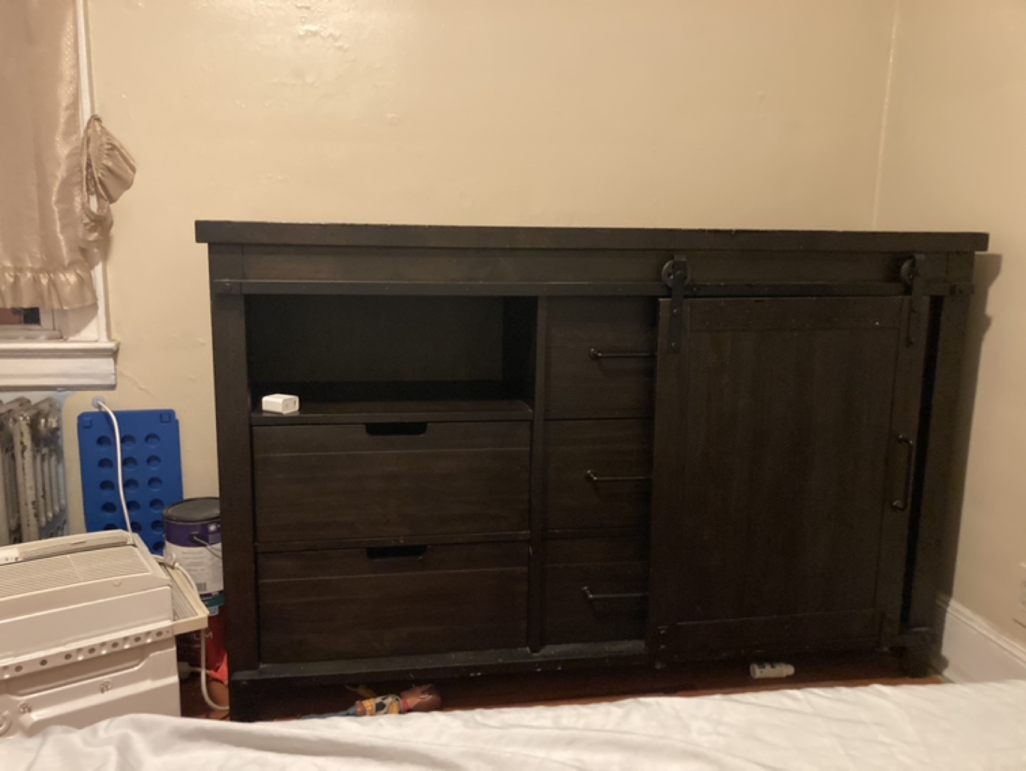 Dark brown dresser with three drawers and a sliding barn door. One shelf behind the door. Some minor wear and tear on the top.