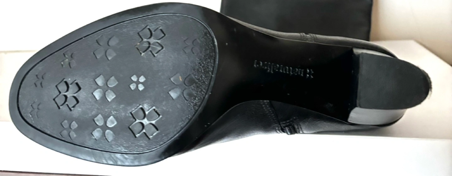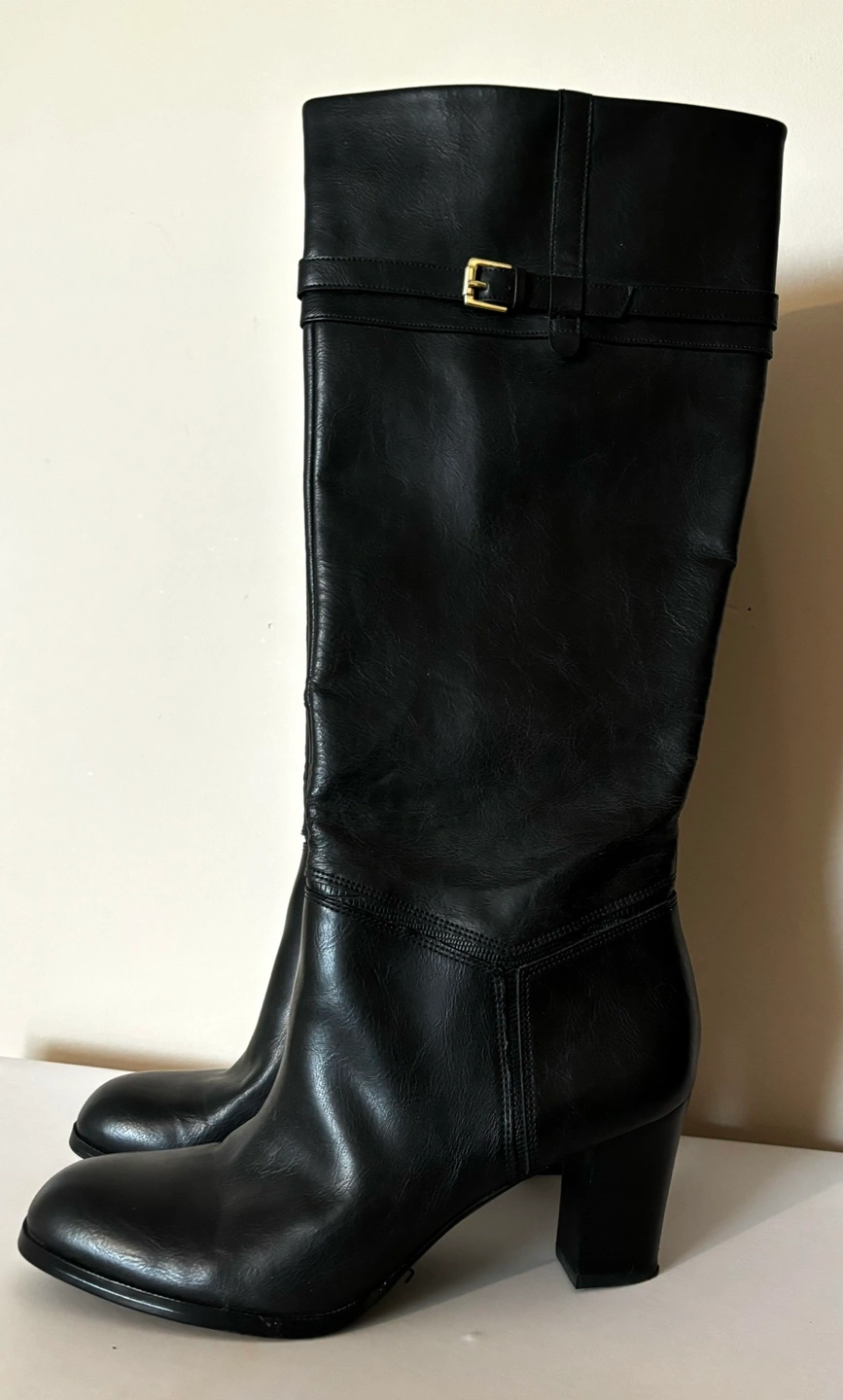 Black leather knee high boots with a block heel and gold buckle detail. Back zipper closure.