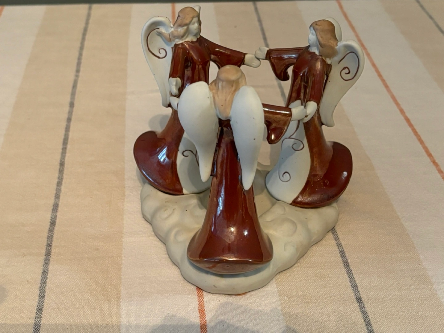 Three ceramic angel candle holders. Holds a tea light candle in the centre. Brown and white glaze.
