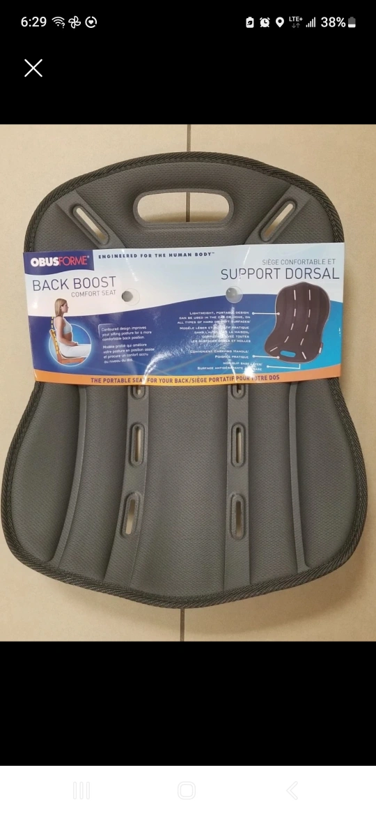 OBUS FORME SUPPORT DORSAL BACK BOOST SUPPORT(Gift idea) Brand New Packed. Comes from a pet - and smoke-free, clean environment please call/ text for a faster reply 647 855 6217 MEET UPS: 1. Tim Hortons at Jane Park Plaza 2. Any subway station from Kipling to young and Bloor FEATURES : Light weight, Portable Engineered for human body bottom and back support. ObusForme Back Dorsal Support Seat Back Booster Back Booster Comfort Seat Improves Sitting Posture. To use soft and hard surfaces. To use for Home /Office chair & Car Seat. To use, turn handled to the front of the seat. Contour Design Improves Posture. Non slip base layer Easy Carrying Handle. Note: Place handle at the front when in use. The seat size is approx 15" NOTE: Original price is way more+ Tax Here Price is the lowest & firm to go away. NOTE: if u like, please see my other ads. Like Leather Shoes, Tennis and Squash rackets, yoga Matts, Bike U locks and Helmets and more….. Mostly Brand Name Mint or in New Condition to go away in about half price. Thanks for your time.
