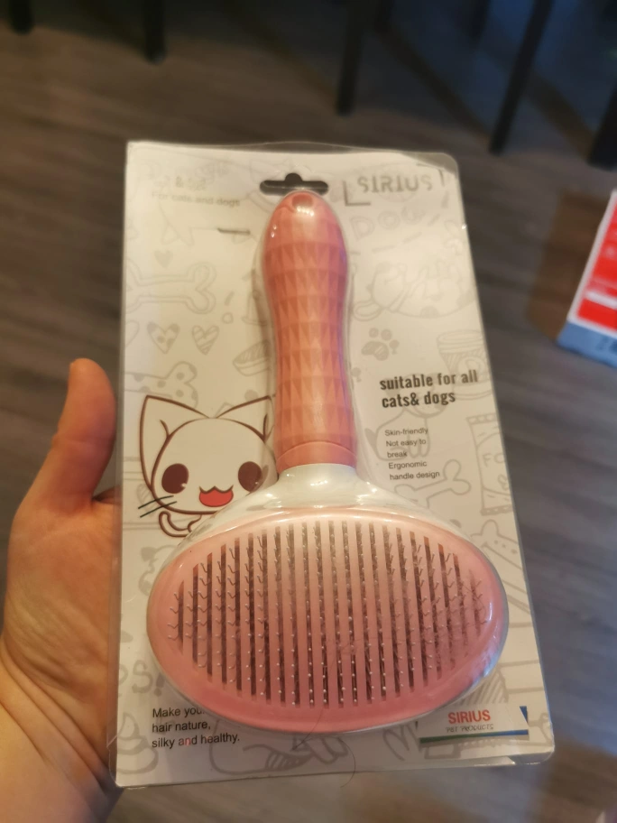 Pet grooming brush. Suitable for cats and dogs. Has a comfortable grip handle. Makes hair silky and healthy.