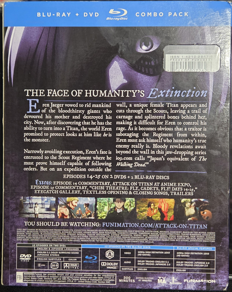 Attack on Titan Season 1 Part 2 Blu-ray + DVD Combo Pack