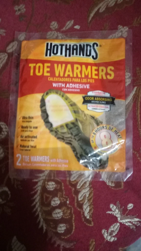 2 toe warmers with adhesive. Contains odor absorbing activated charcoal. 8 hours of heat.