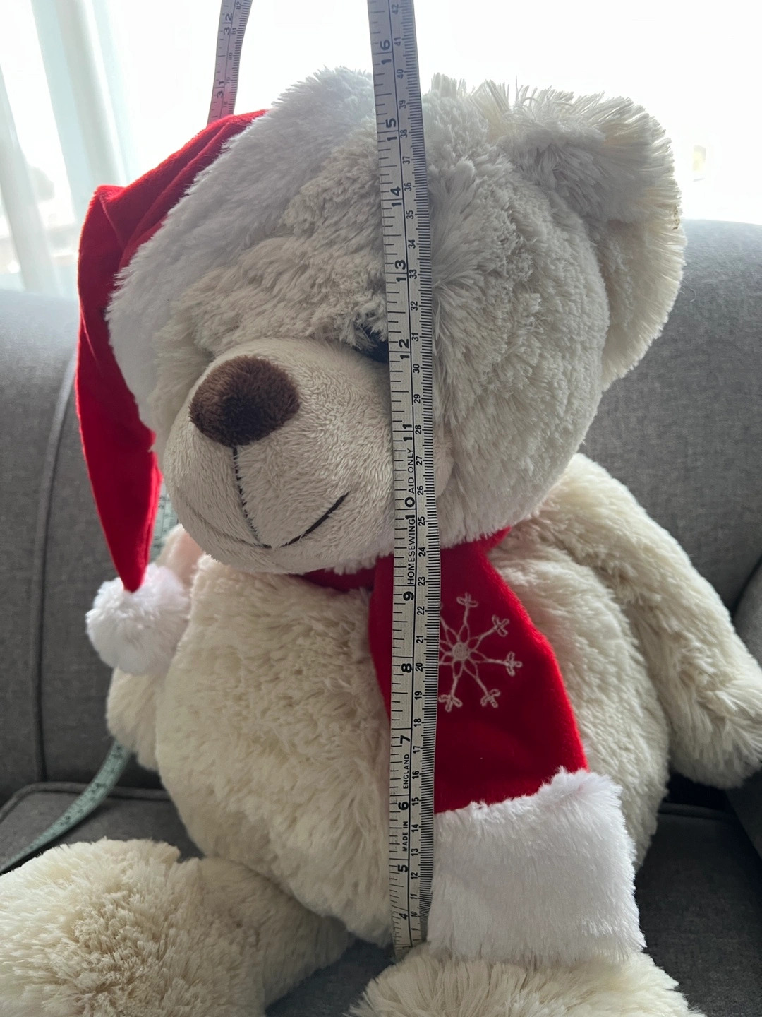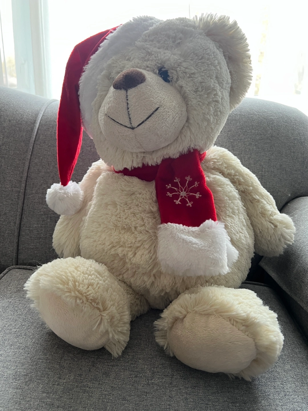 Large cream plush bear with a red Santa hat and a red scarf with a snowflake design. The bear is approximately 16 inches tall.