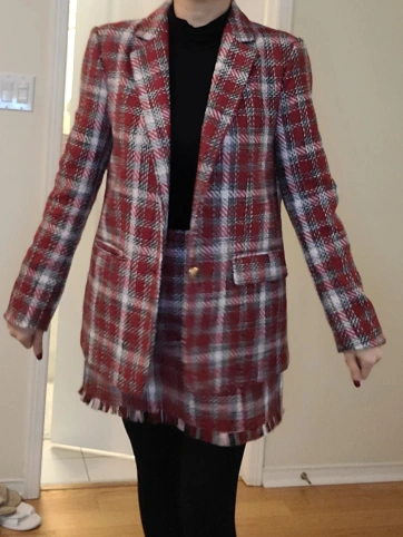 Red plaid blazer and skirt set with gold buttons. Fringe detail on the skirt. Size L.