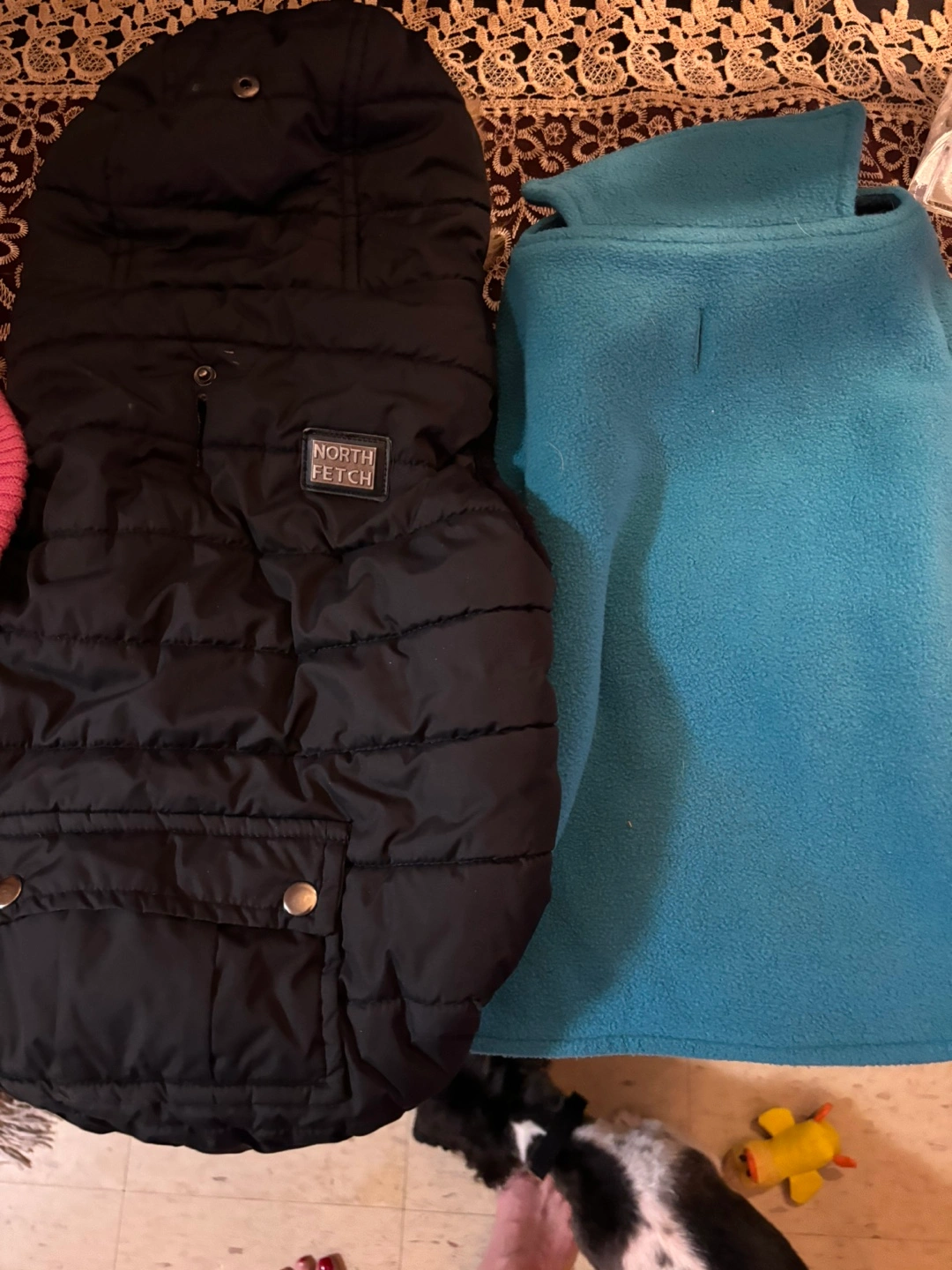 It’s free to big for my dogs and she’s 10 pounds and the other is 4 1/2 so roughly I think it would probably fit 15 pounds. I’m guessing , but they have to be picked up in the next 24 hours Black puffer coat with a hood. Has a North Fetch logo on the chest. The other one is just a blue regular dog jacket. and also,