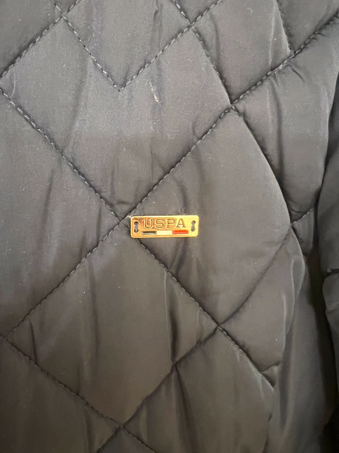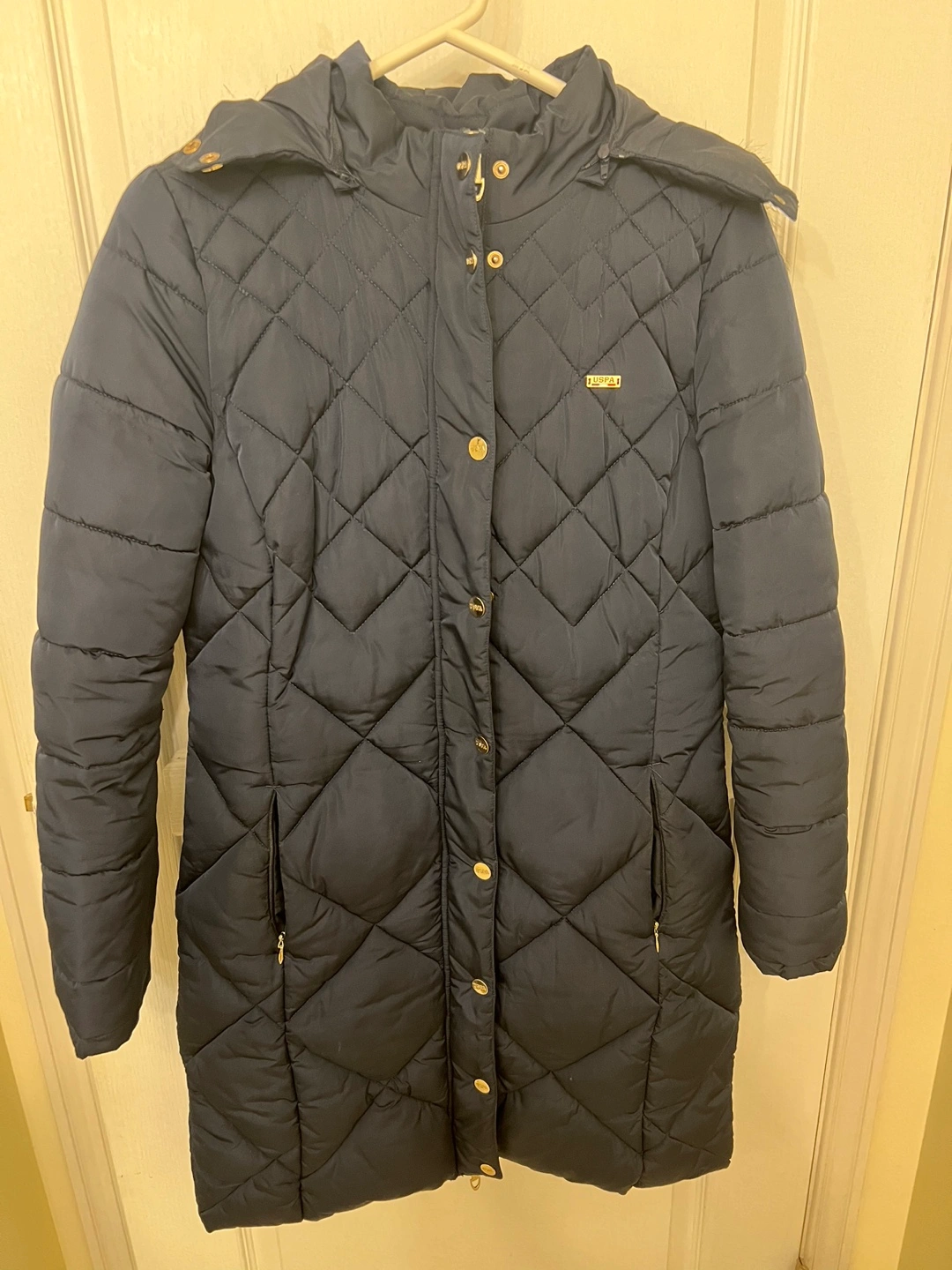 Long navy blue winter coat with a faux fur hood. Features a quilted design and gold buttons. Size 38.