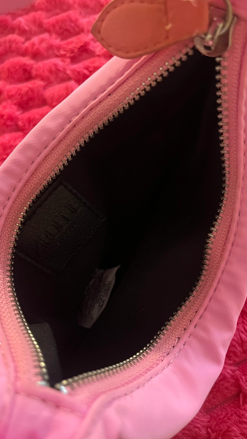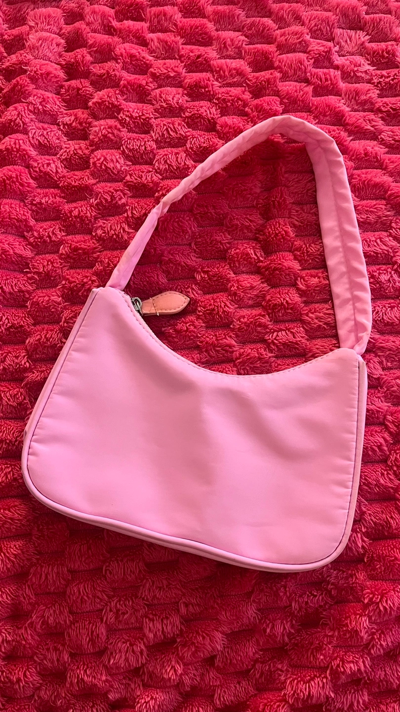 Small pink baguette bag with a zipper closure. The bag has a single shoulder strap. Perfect for carrying essentials.