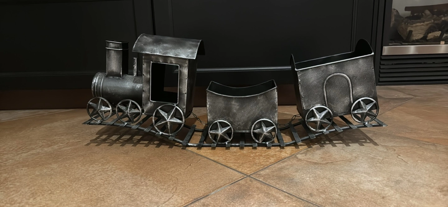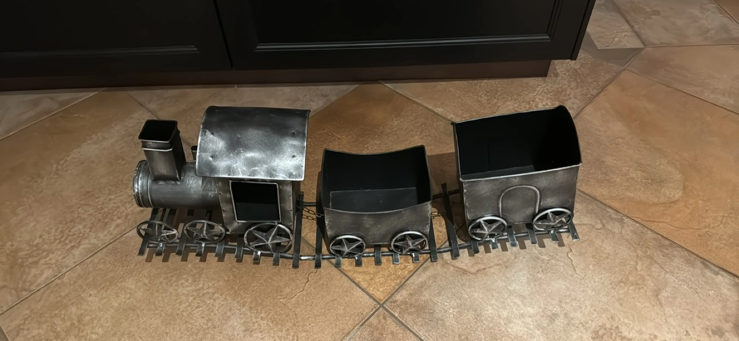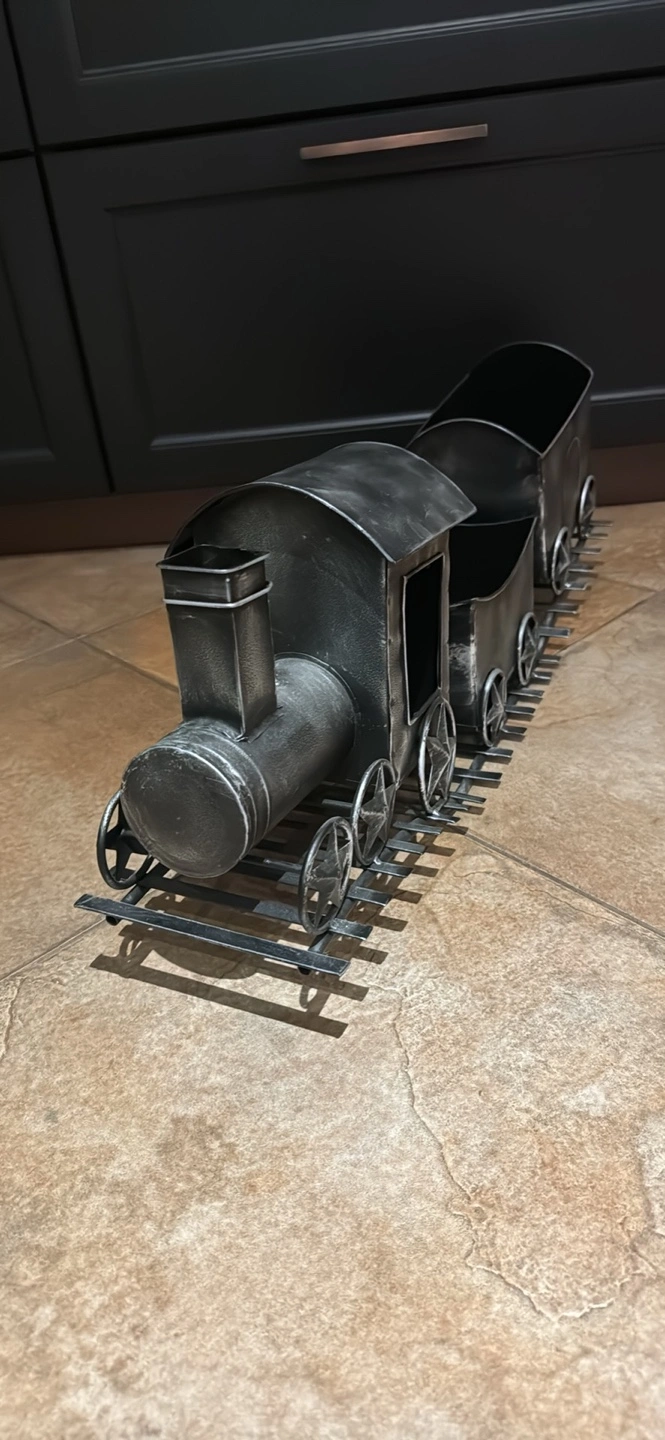 Metal train with three cars. Could be used for plants or other decor. Great for a farmhouse or rustic decor.