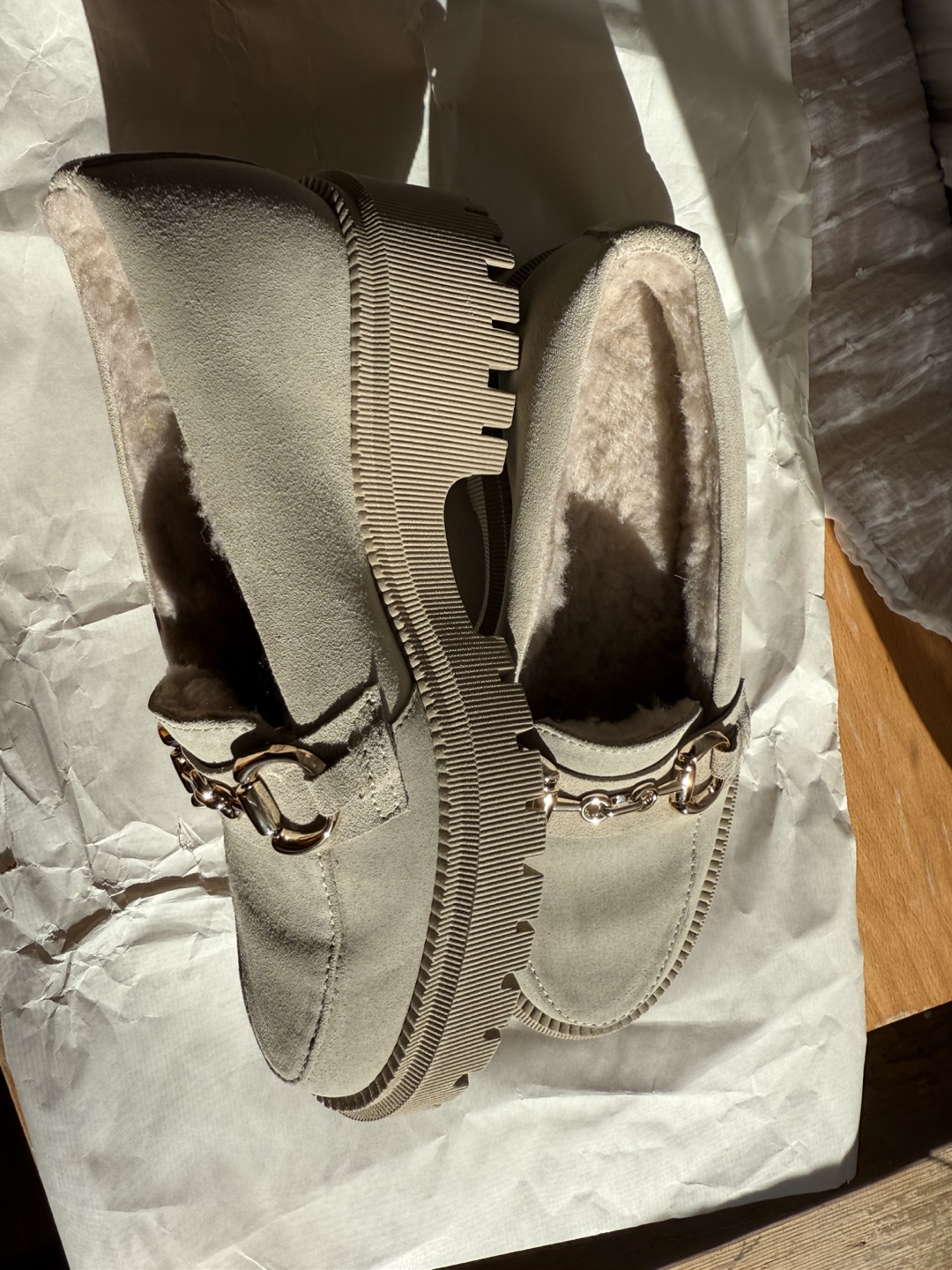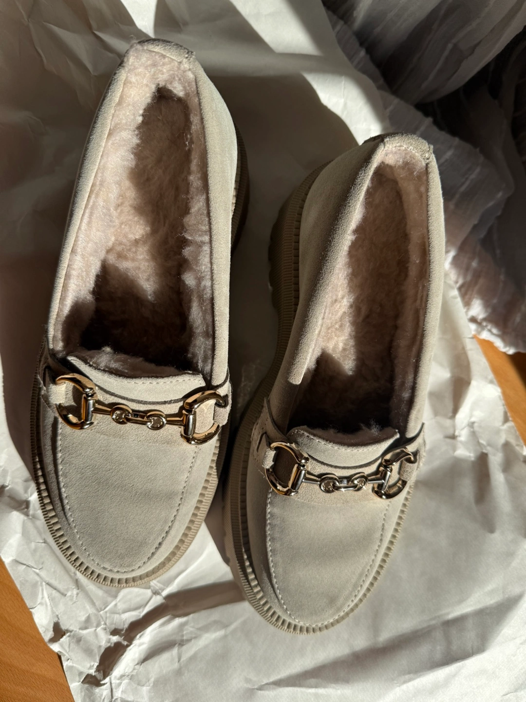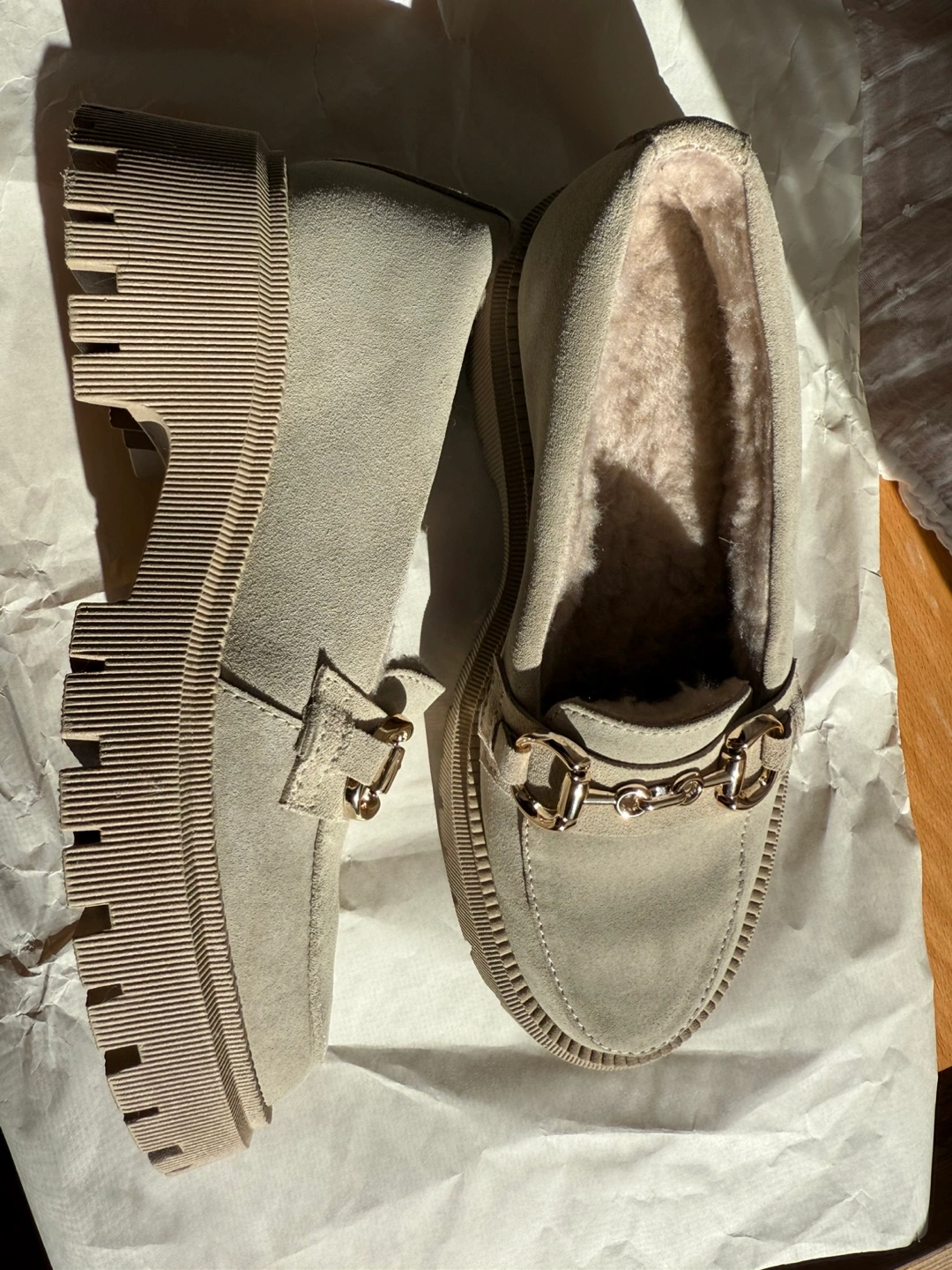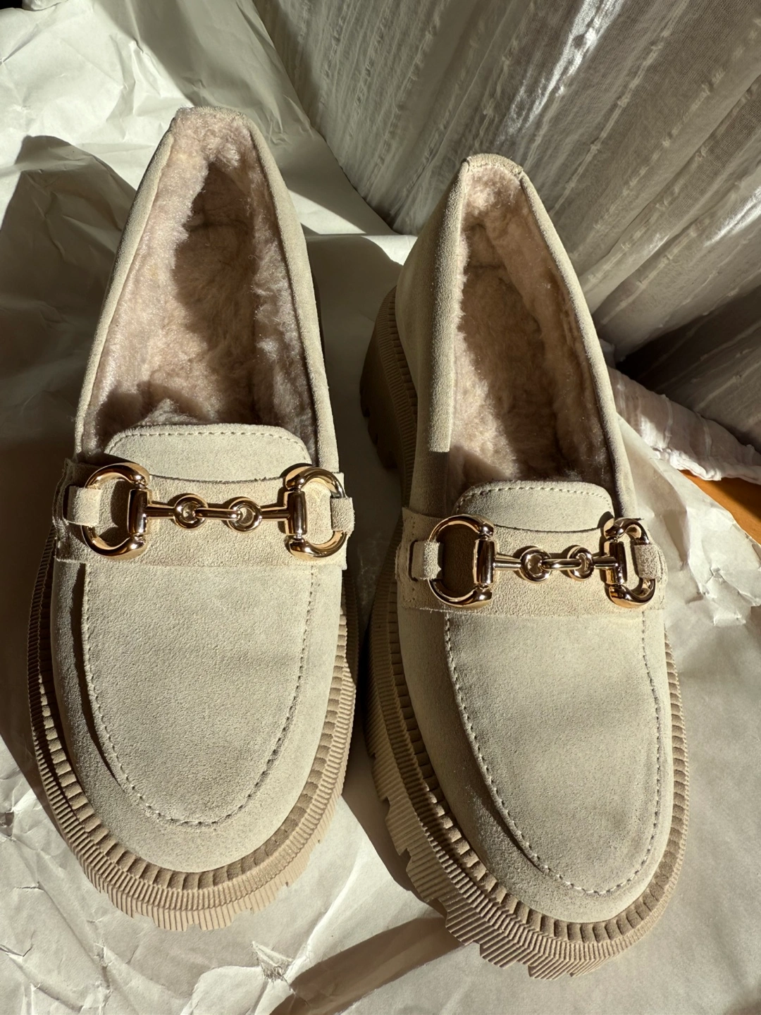 Tan suede loafers with gold chain detail and a platform sole. Faux fur lining. Size 36