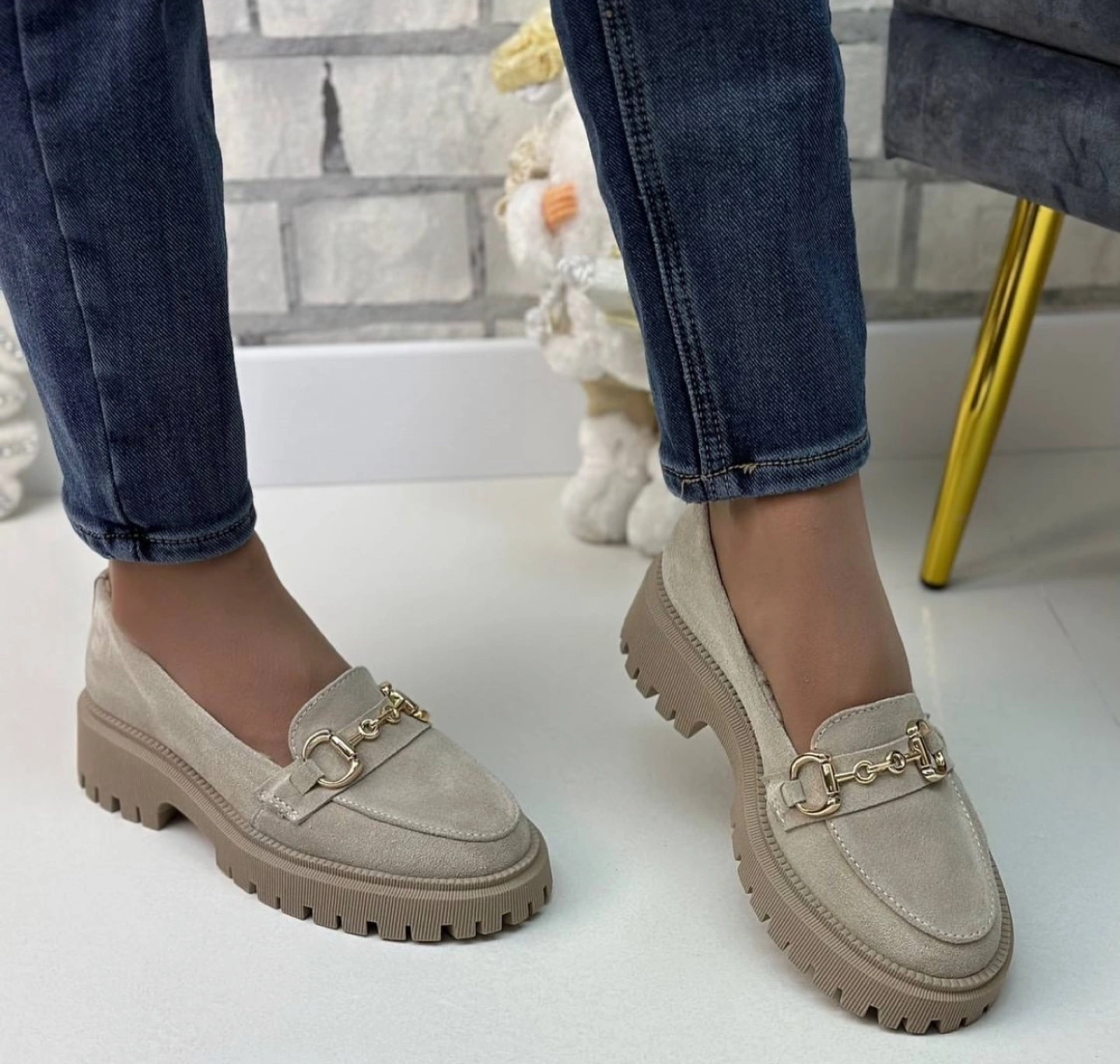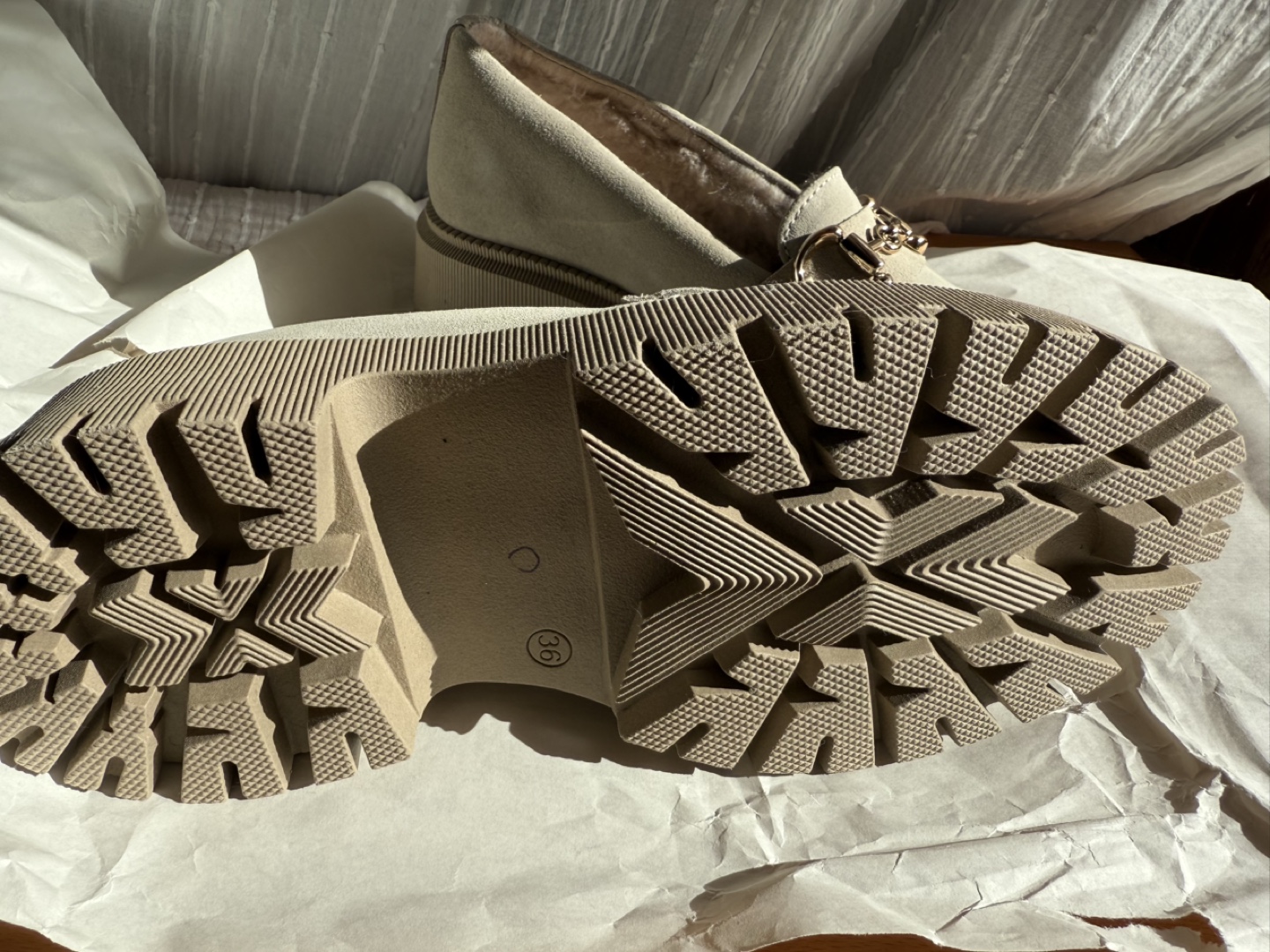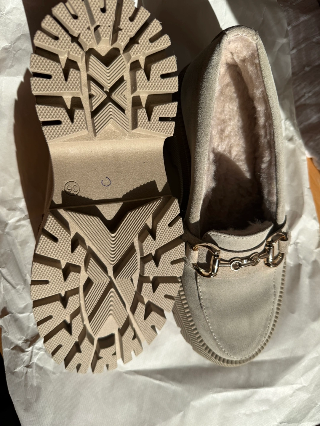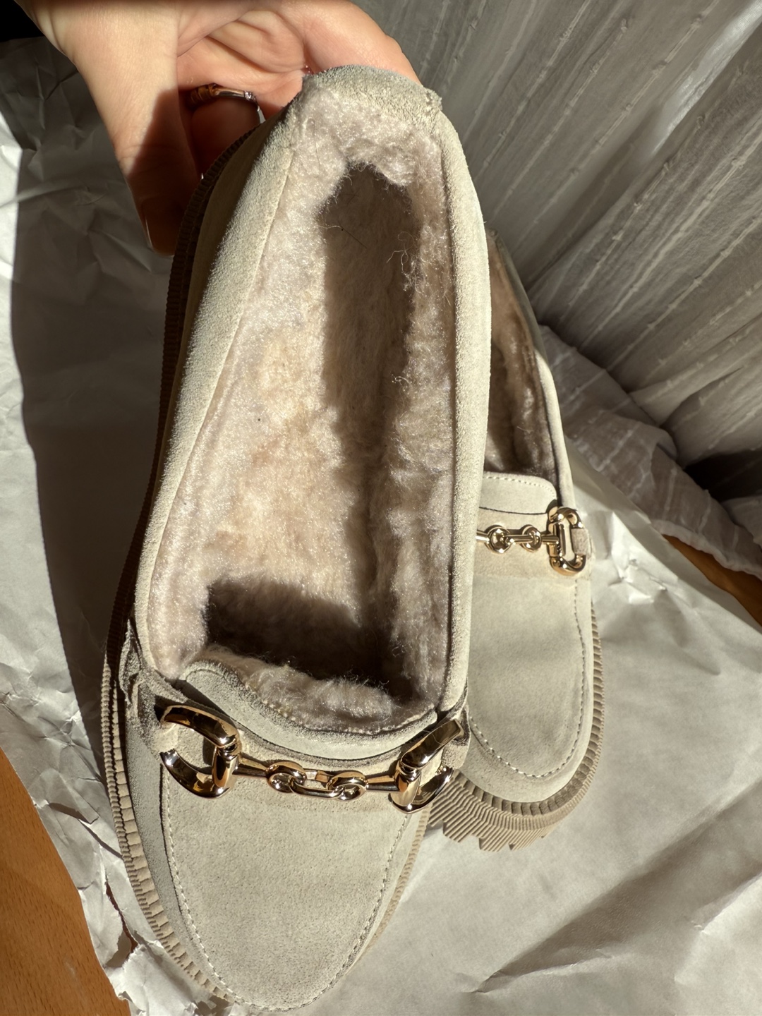 Tan suede loafers with gold chain detail and a platform sole. Faux fur lining. Size 36