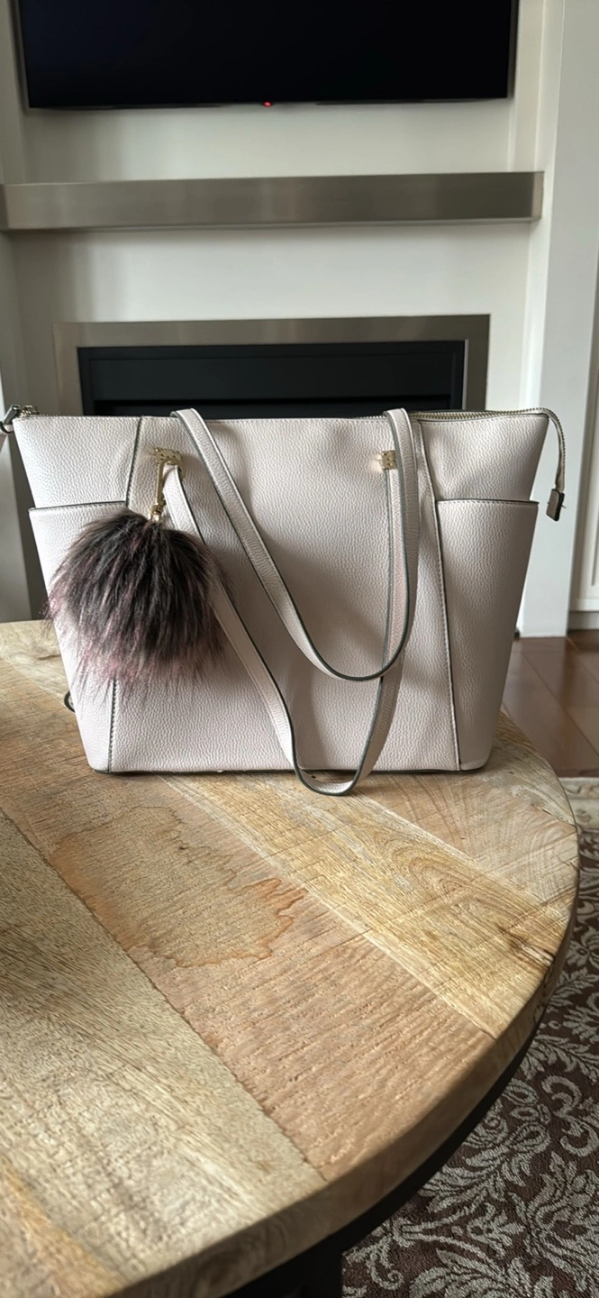 Tote bag with a zip closure, two handles, and a removable pom-pom keychain. It has several pockets for organization.