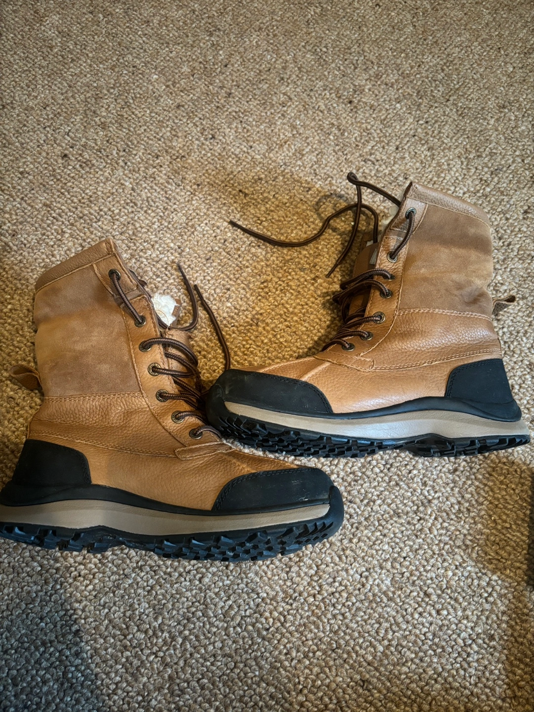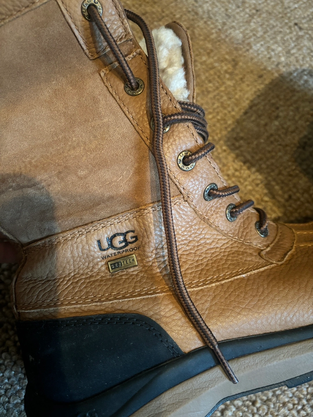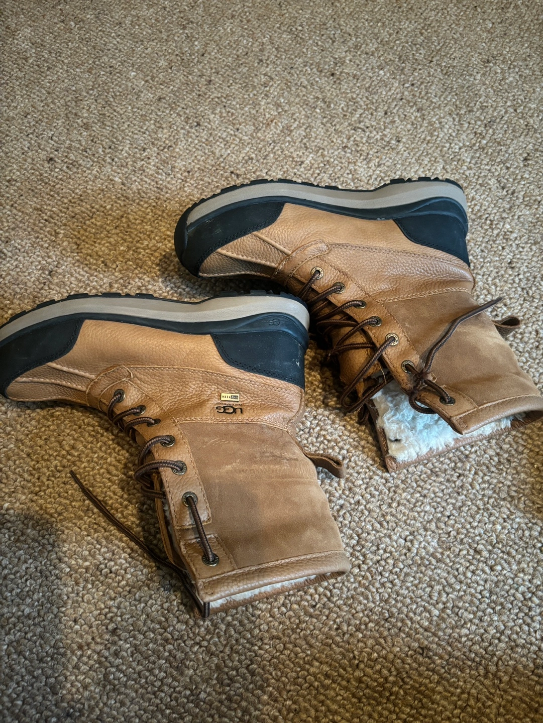 Please note the left boot tongue is damaged hence the low price. Does NOT affect usability of the boot. They are still great, warm, waterproof, Ugg quality.