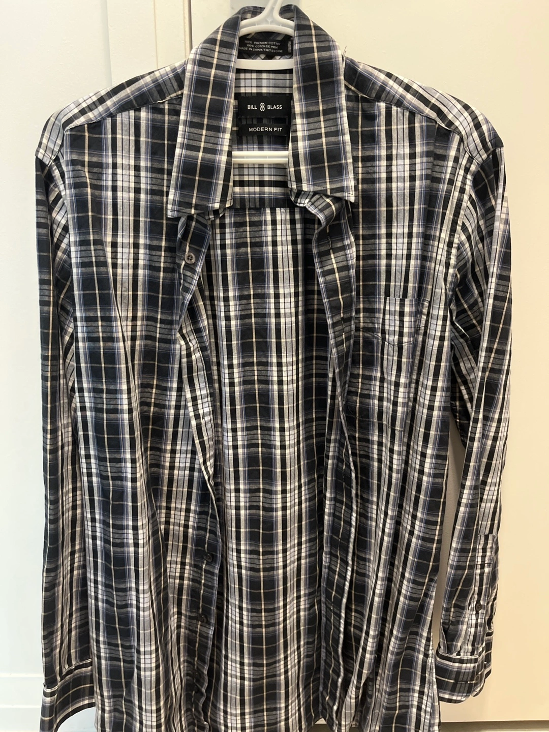 Long-sleeved button-down shirt in a black and white plaid pattern. Modern fit.