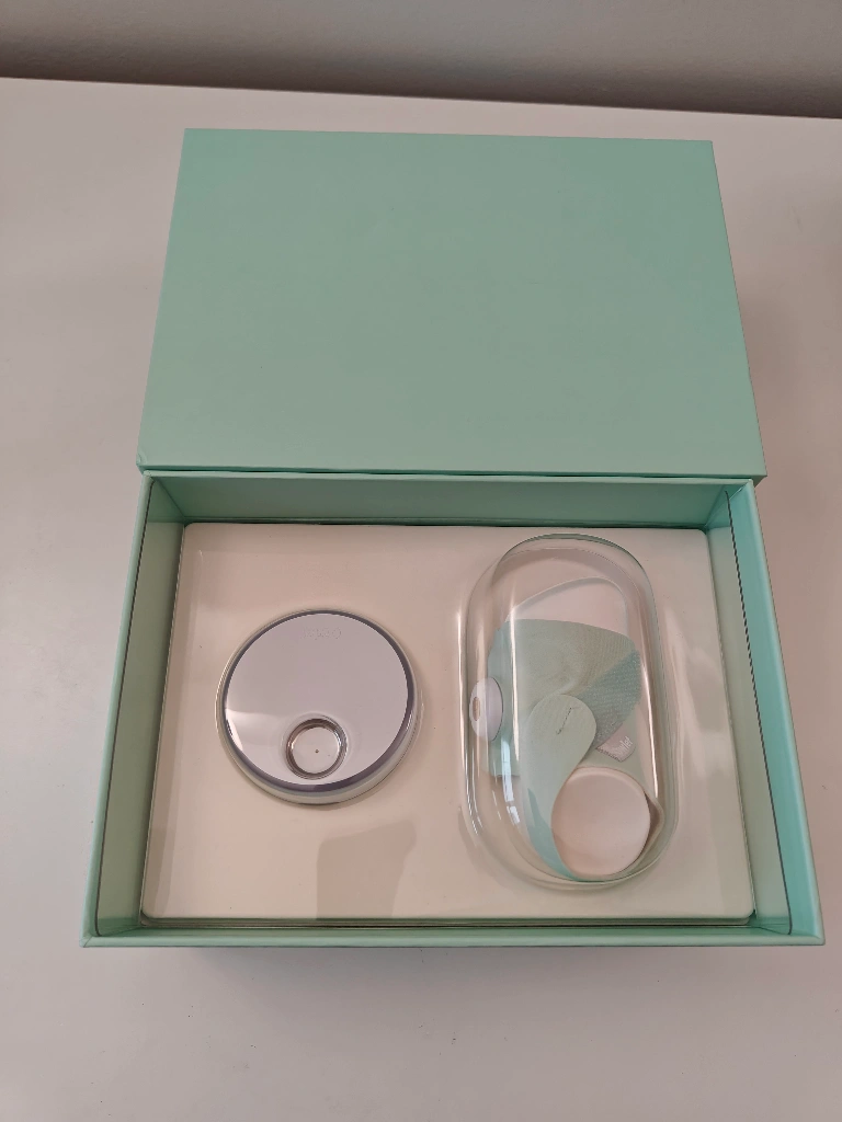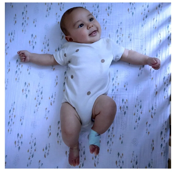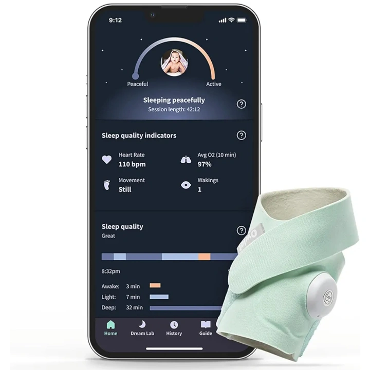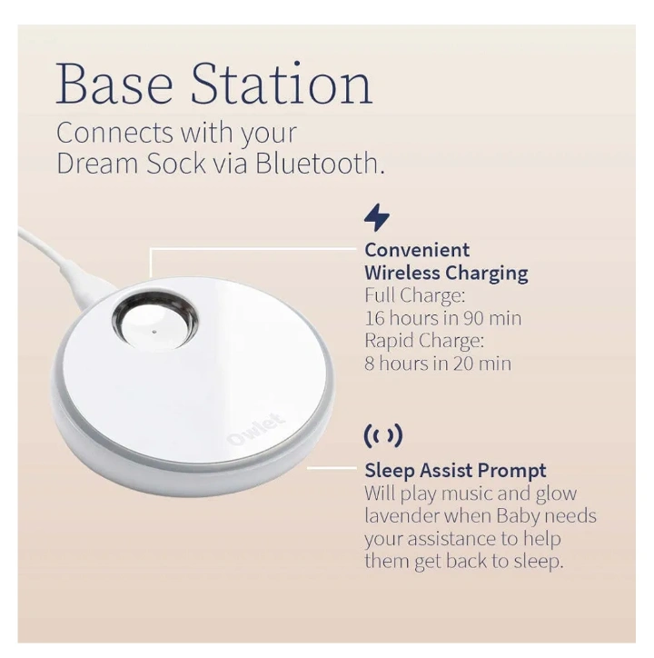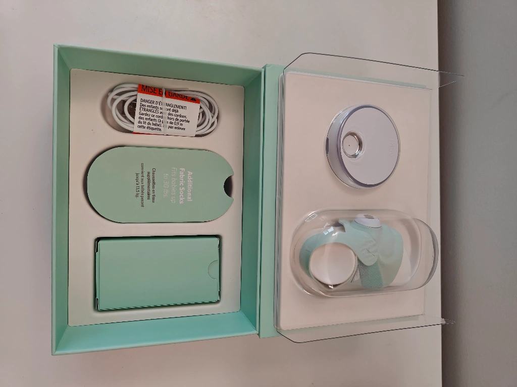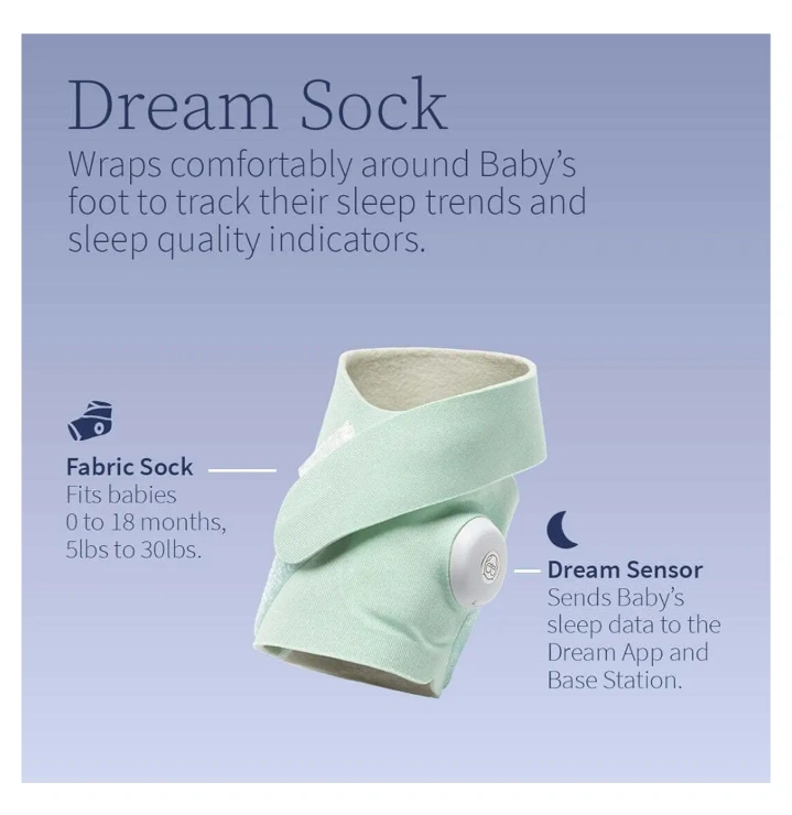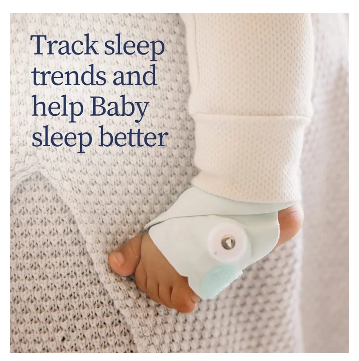 Baby sleep tracker with base station and sock. Tracks baby's sleep trends, heart rate, oxygen levels, and movement.