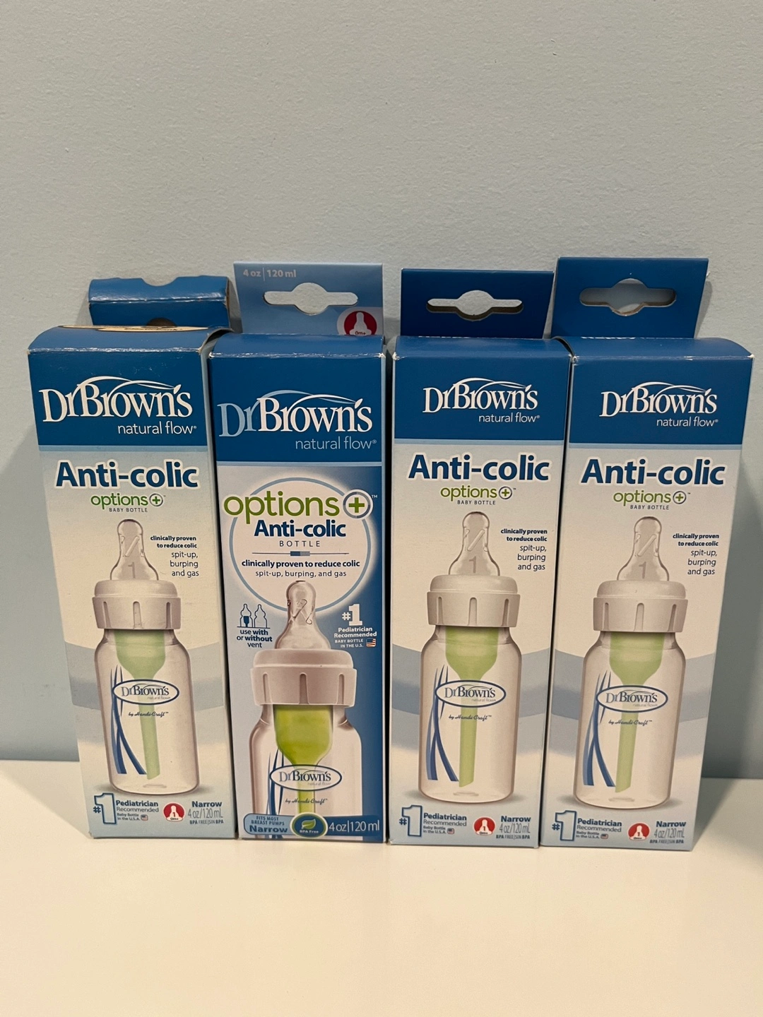 Set of four 4oz Dr. Brown's Options+ Anti-Colic Baby Bottles with narrow nipples. Clinically proven to reduce colic, spit-up, burping, and gas.