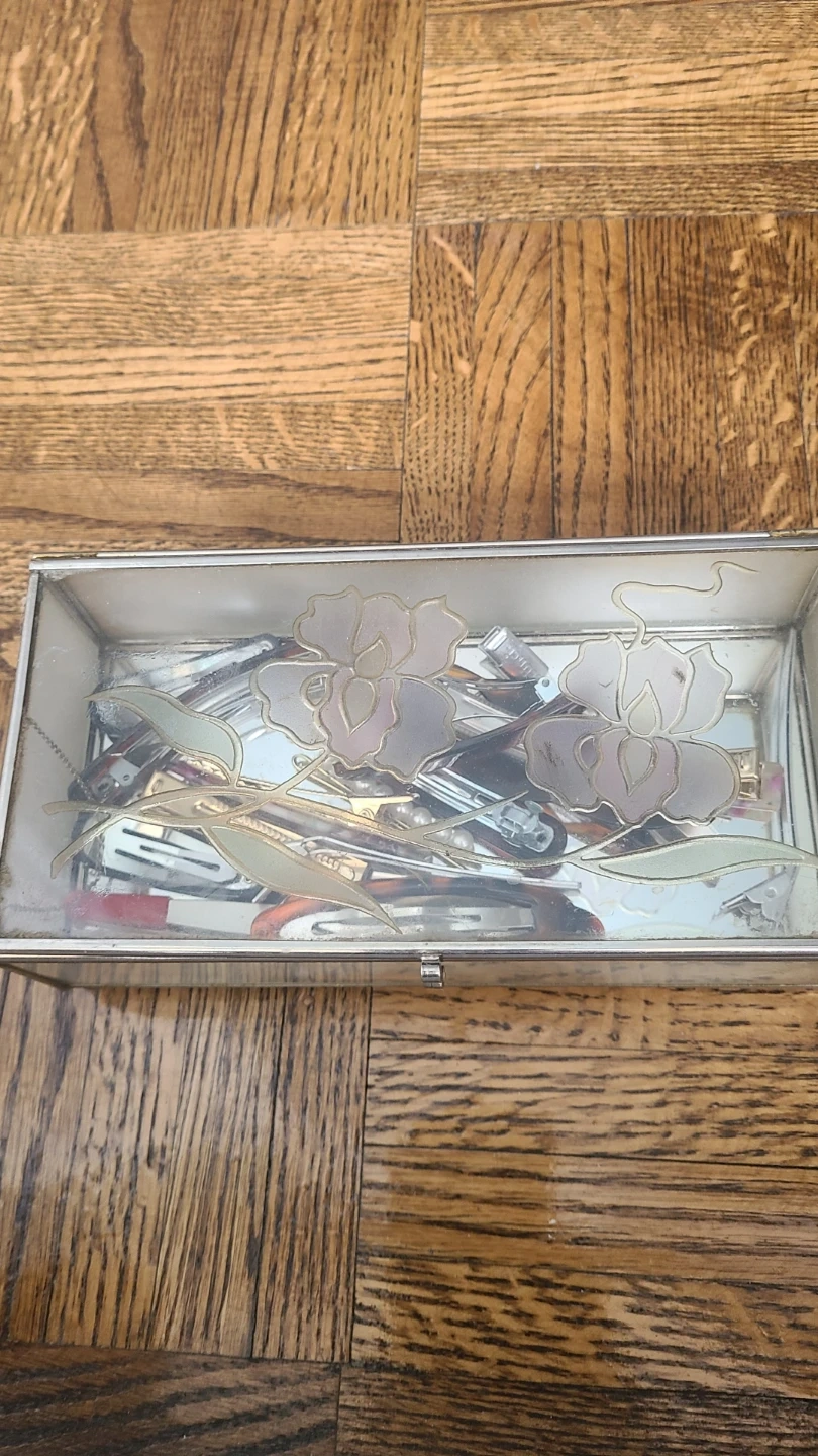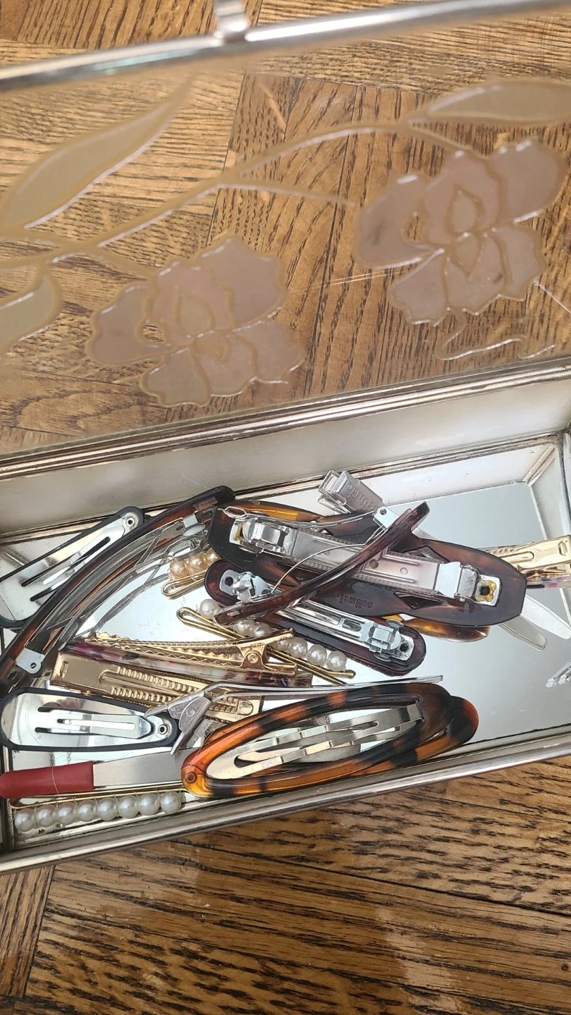 A collection of assorted hair clips and barrettes, including tortoiseshell and pearl-embellished styles. This decorative box contains a variety of hair accessories for different styles and occasions. Useful for organizing and styling your hair.