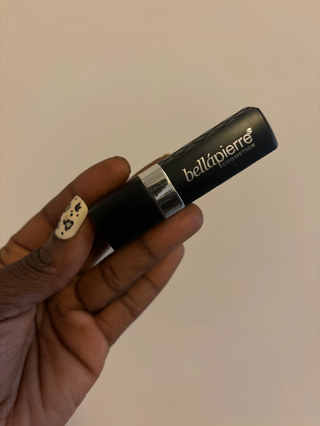 Red lipstick in a black and silver tube. The tube has a diamond pattern.