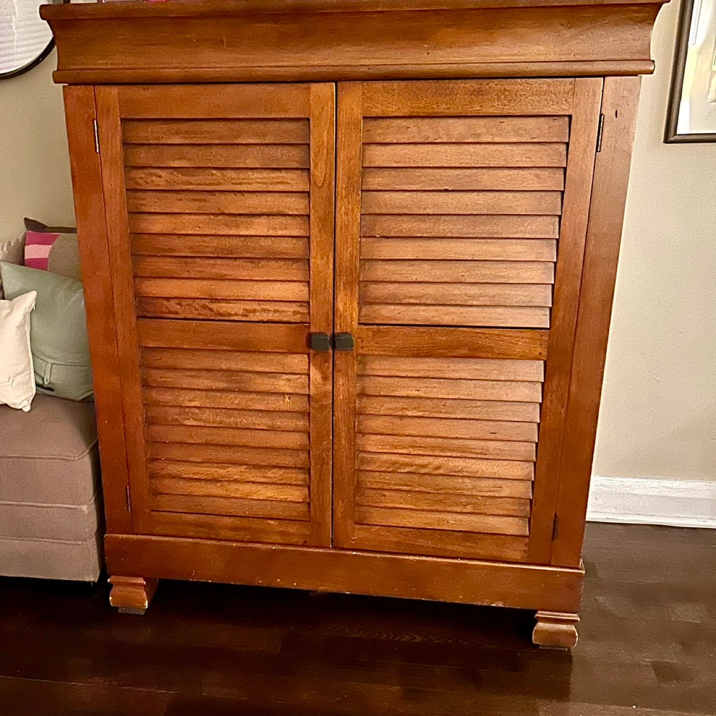 Wooden cabinet with louvered doors. Two doors with black hardware. Pottery Barn tv cabinet with drawer for storage, shelf for modem or dvd player. Holes in back. Measurements to follow.