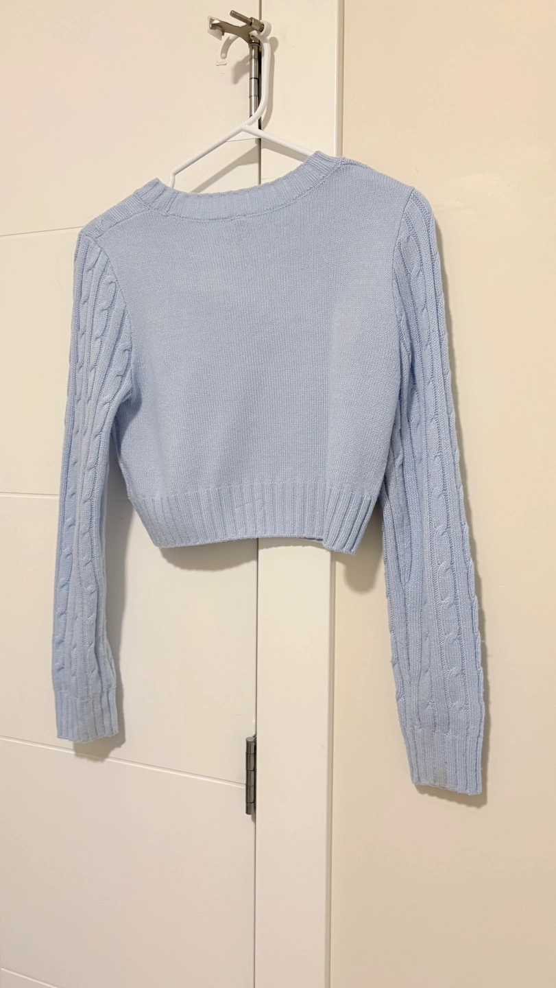 Light blue cable knit cropped sweater with long sleeves. Size small.