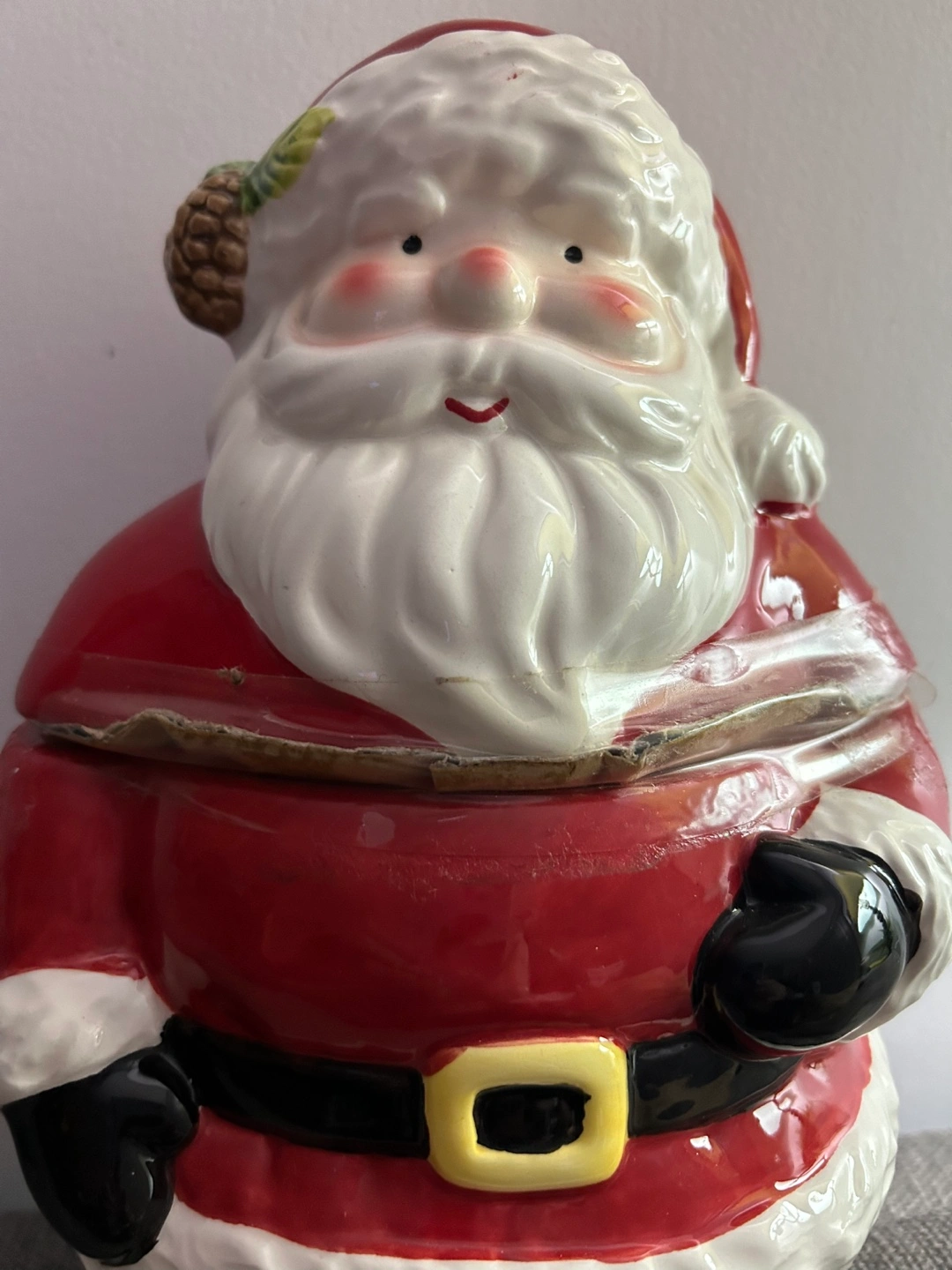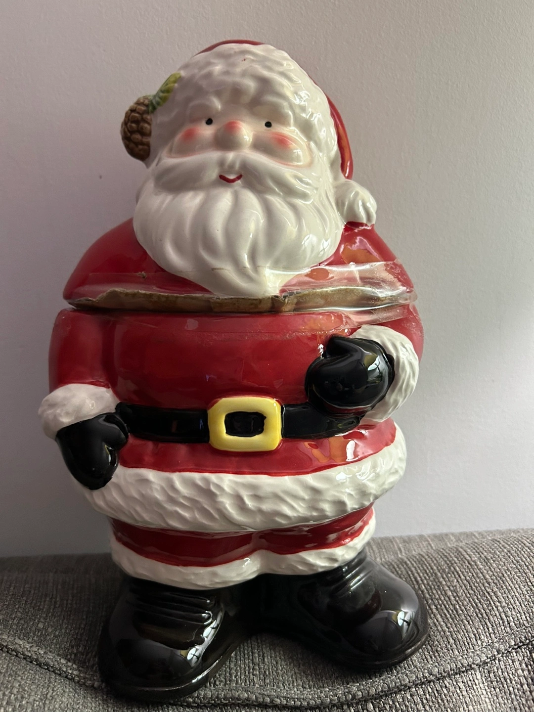 Ceramic vintage cookie jar shaped like Santa Claus. Great for holiday baking.