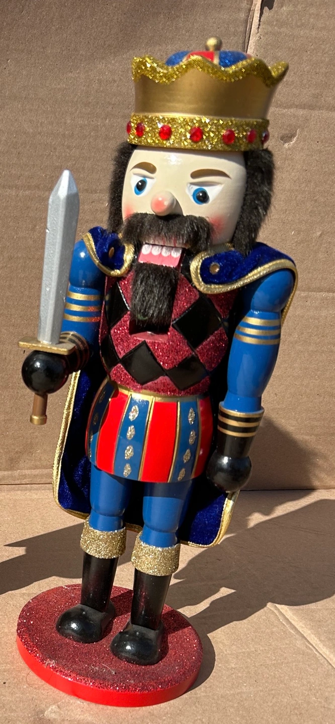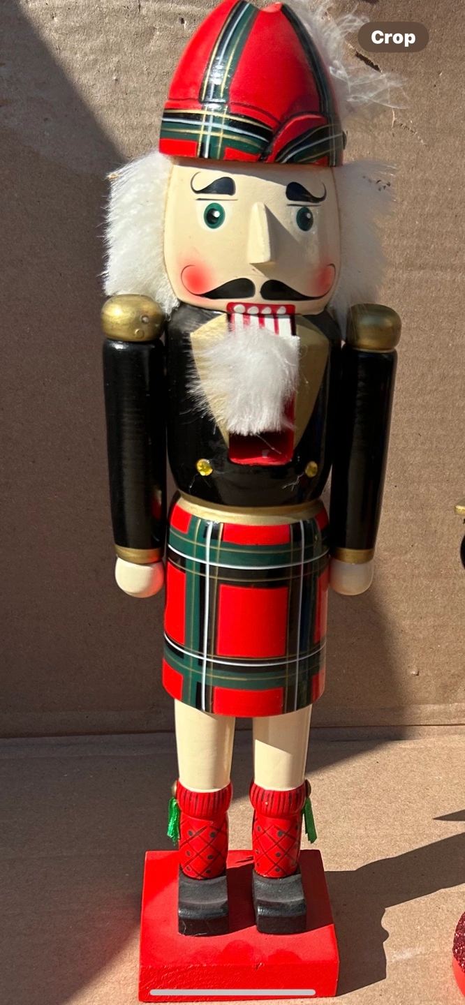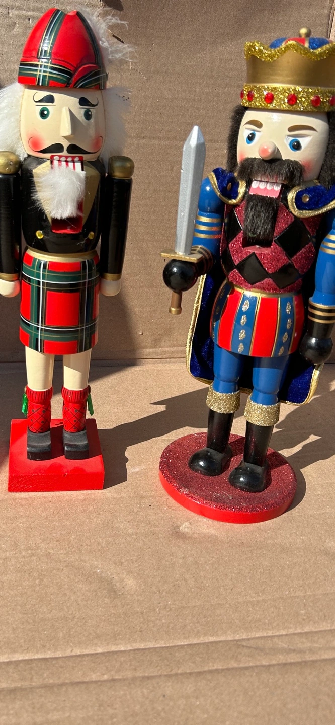 Set of 2 vintage Bombay nutcracker ornaments. One is a king in blue and the other is wearing a red plaid kilt. Both have a wood base. Each $15.