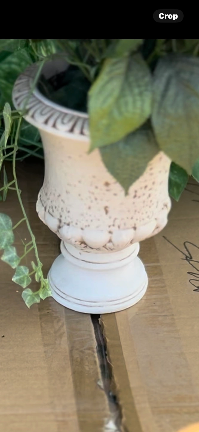 White urn planter with distressed look. Perfect for artificial flowers or plants. Measures approximately 26 inches tall.