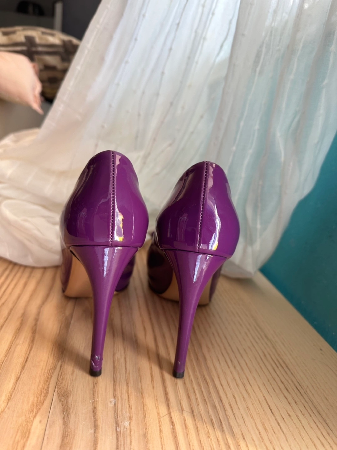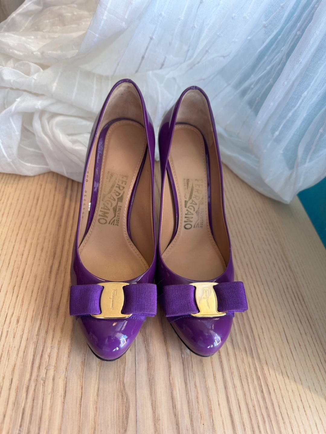 Purple and Black patent leather pumps with gold accents. Bow detail on the toe. Size 5 1/2.Each $69 Both $119