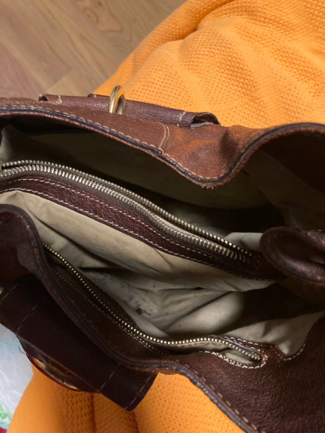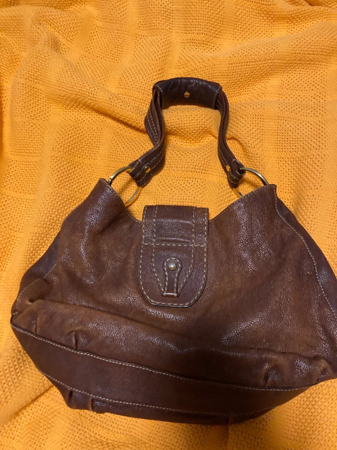 Brown leather hobo bag with gold hardware. Two compartments with zipper middle pocket closure. One smaller pocket on the front.