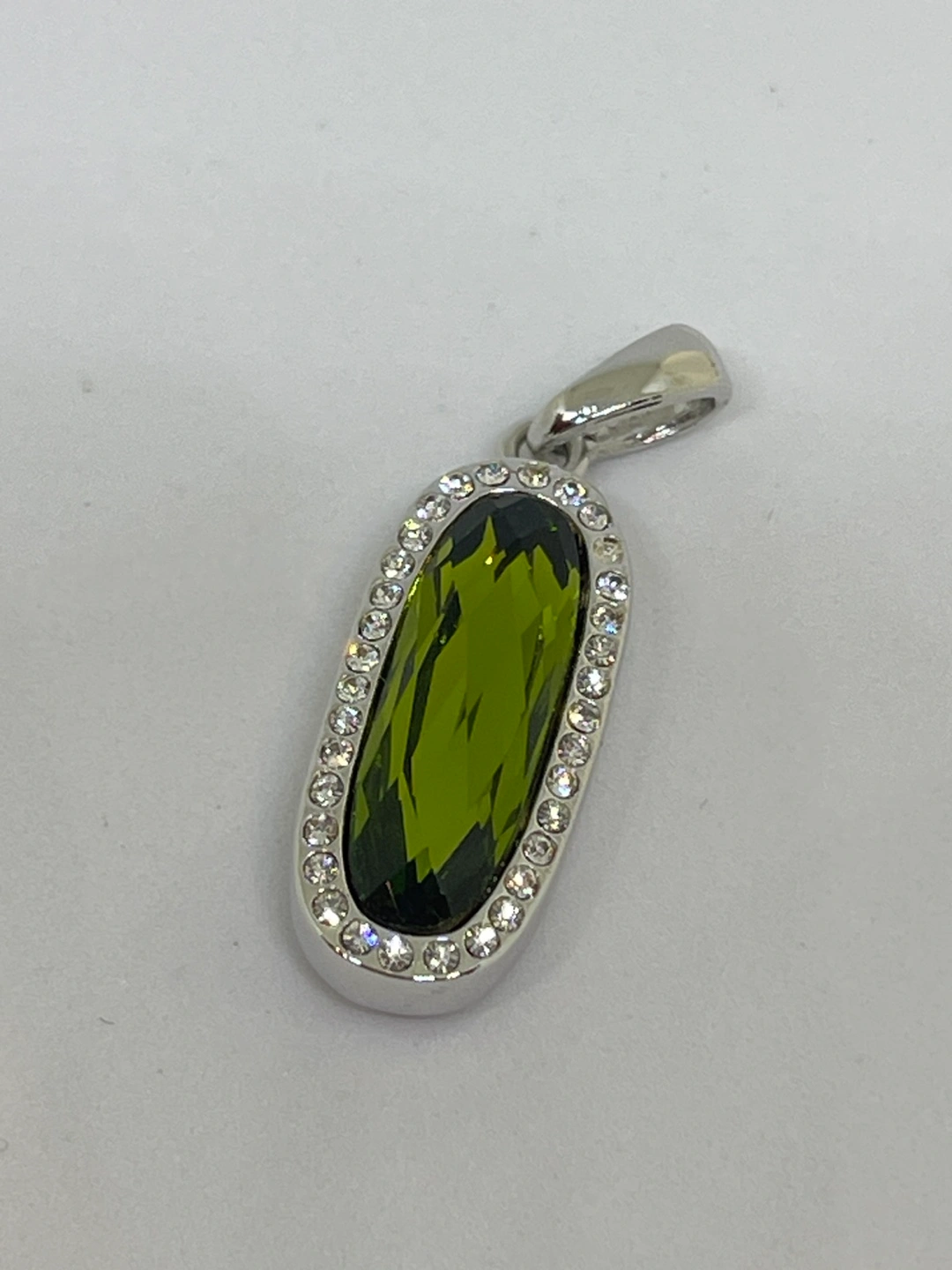 Silver pendant with a green crystal. The pendant is oval shaped with a silver border of small clear stones.