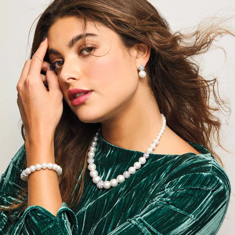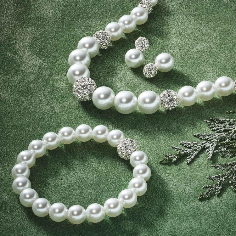 All glass pearls with dazzling silvertone-plated fireballs.