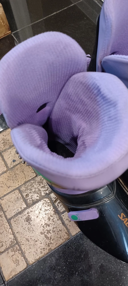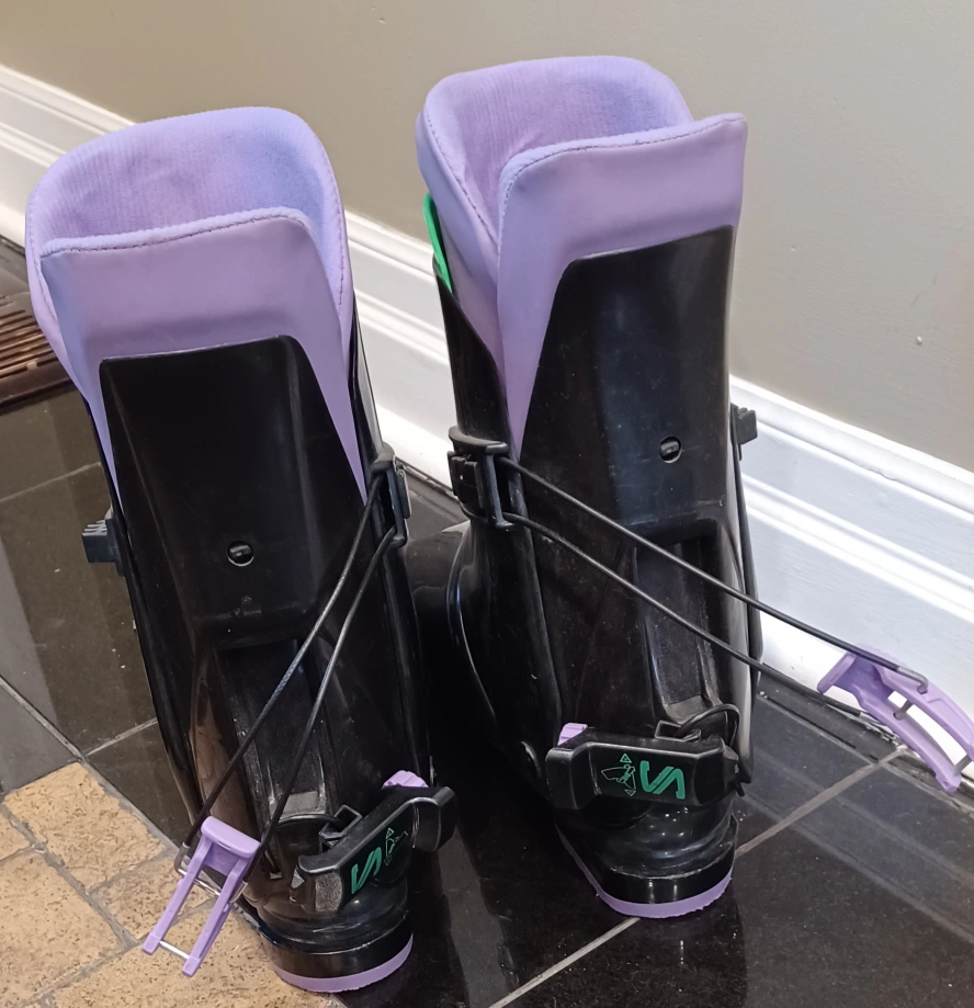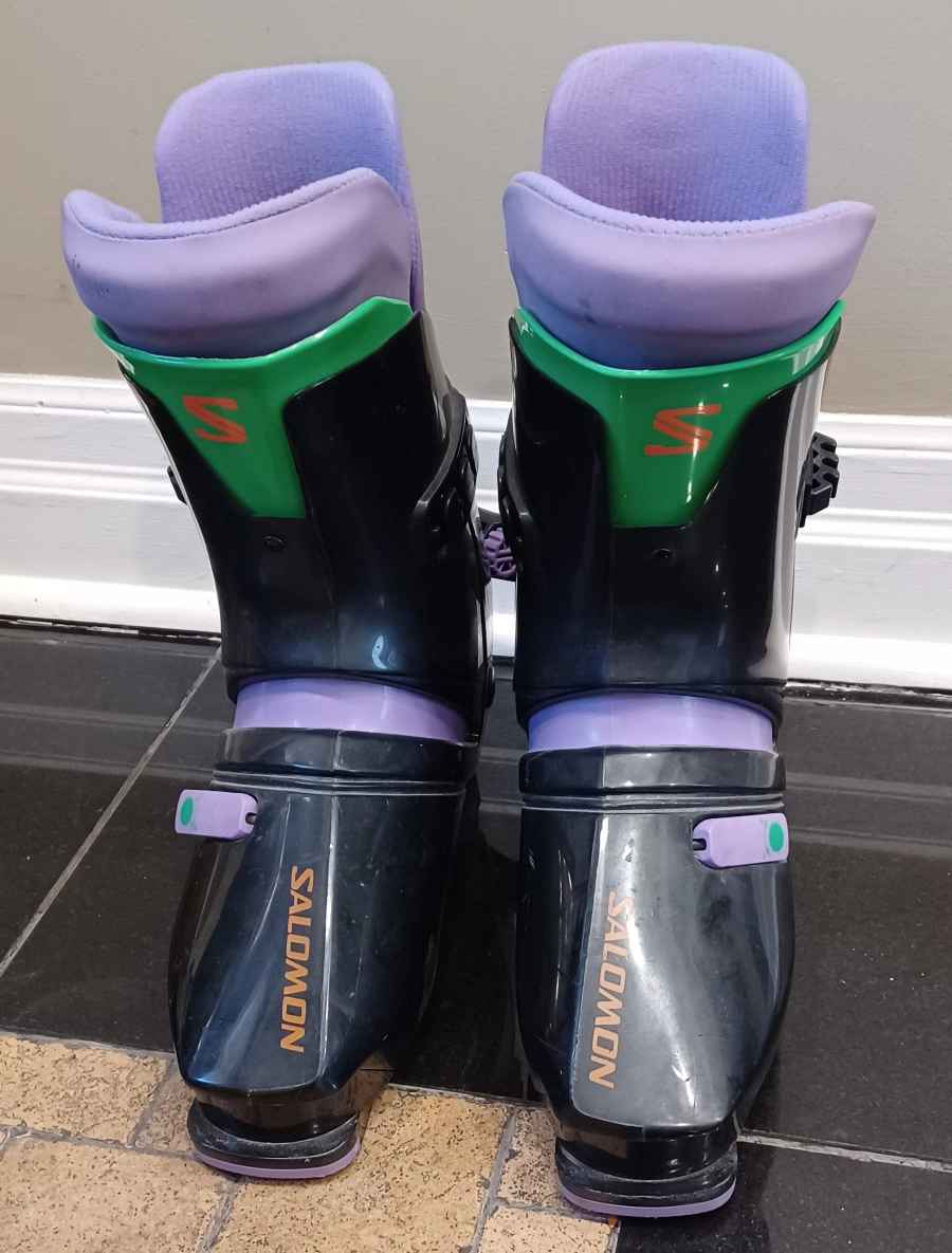 Pair of Salomon ski boots. Black with purple and green accents. I tried to read the chart check, please the pictures. If im not wrong, the size is US men's 17-17.5 good Condition