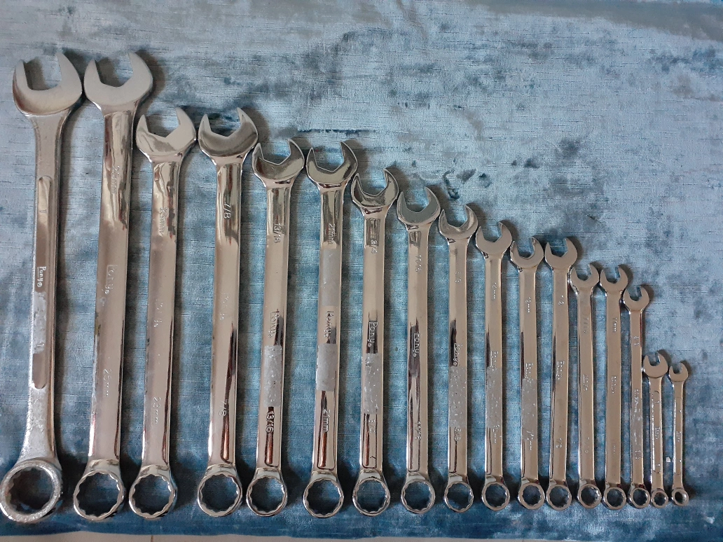 Never used Pony Drop Forged Wrenches. Strong and durable. Mirror polish 17 pieces: 1,25mm, 23mm, 7/8, 13/16, 21mm, 3/4, 11/16, 5/8, 14mm, 12mm, 1/2, 7/17, 11mm, 3/8, 8, 7.