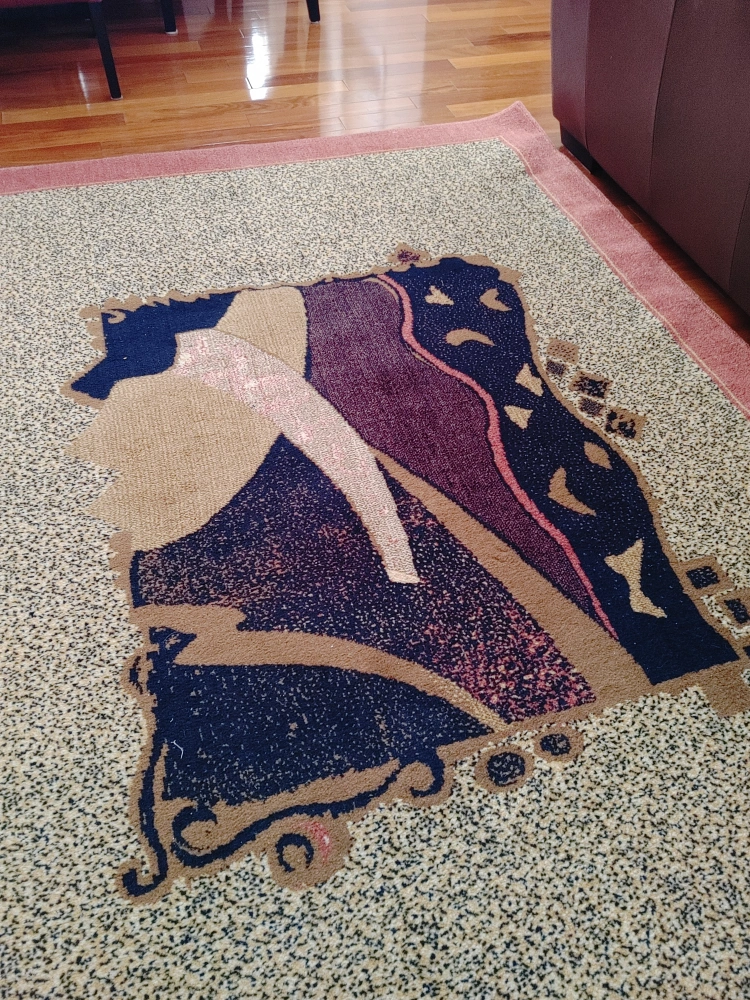 Large area rug with abstract design. Wool. Made in Kazakhstan. It is an area rug and a piece of art at the same time. Stored in our house, not used. Decided to sell because we are moving.
