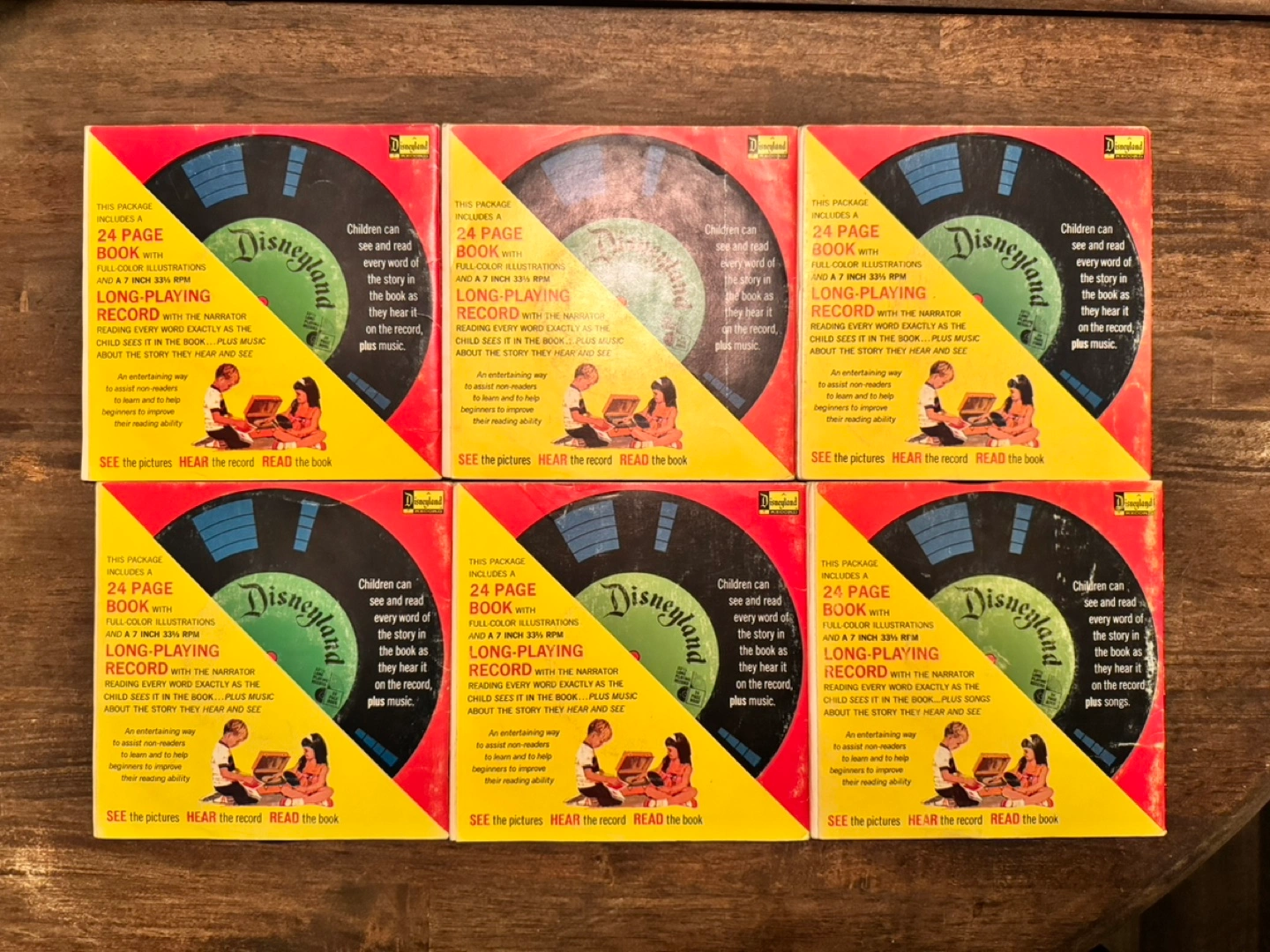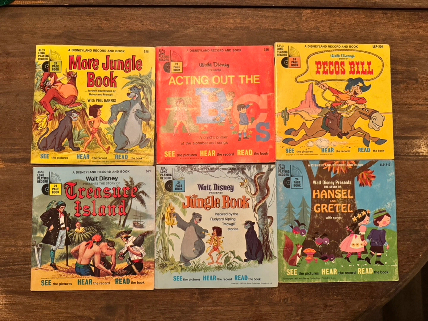 Set of six vintage Walt Disney record and book sets. Includes: More Jungle Book, Acting Out the ABCs, Pecos Bill, Treasure Island, Jungle Book, Hansel and Gretel.