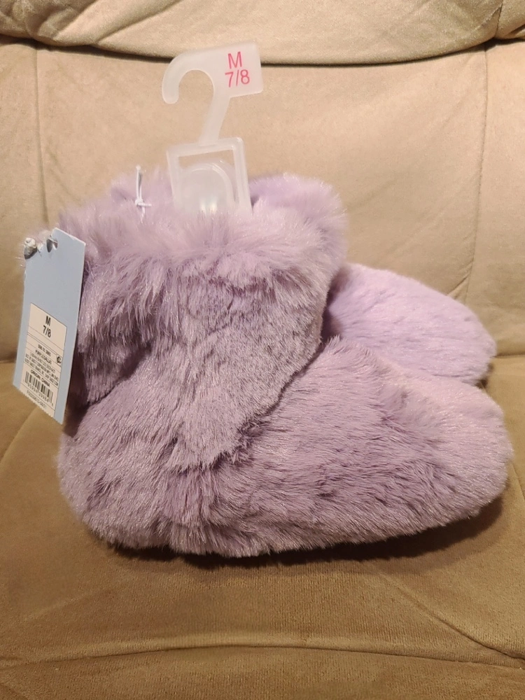 Very cute and soft purple fuzzy slippers, size medium (7-8). New, never worn, with tags.