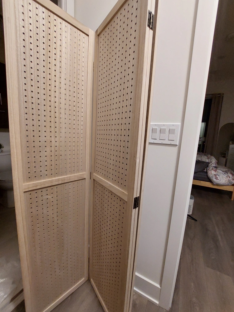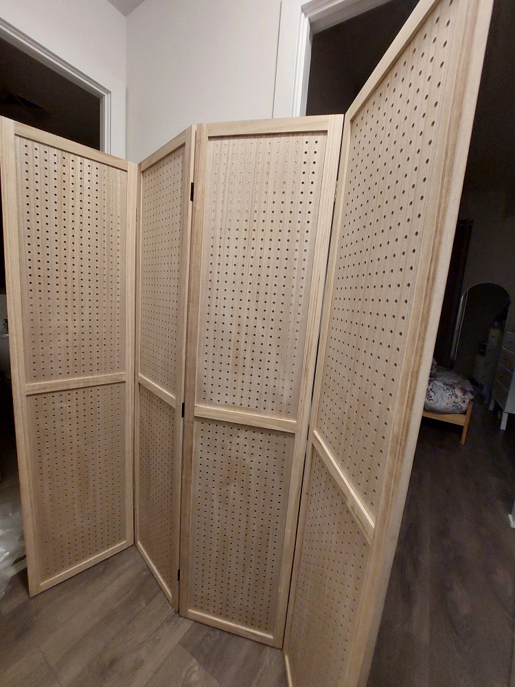 Four-panel room divider, made of wood with a light wood stain. Pegboard pattern, which can be used to customize tools or accessories. Good for displaying. Panels are hinged together.