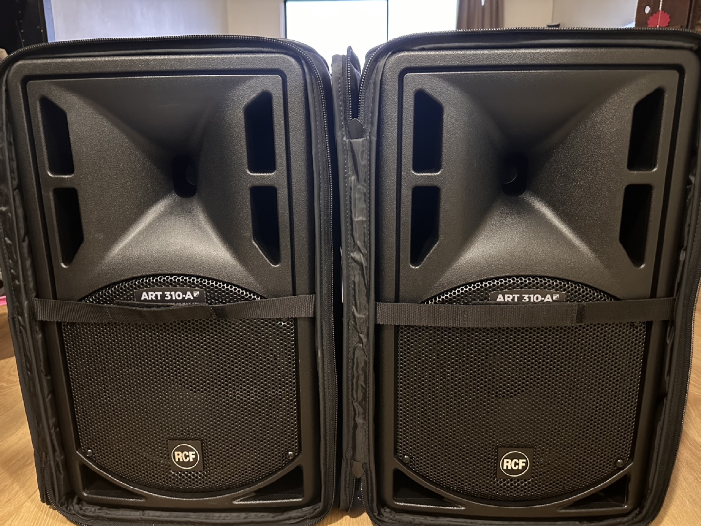 Pair of RCF ART 310-A speakers with cases and two voltage transformers. Speakers are in good condition, used for only a few gigs. Cases and transformers are in good condition as well.
