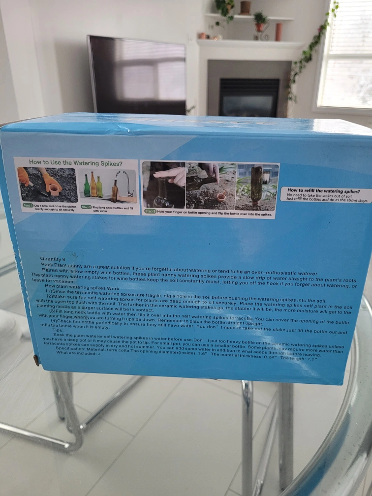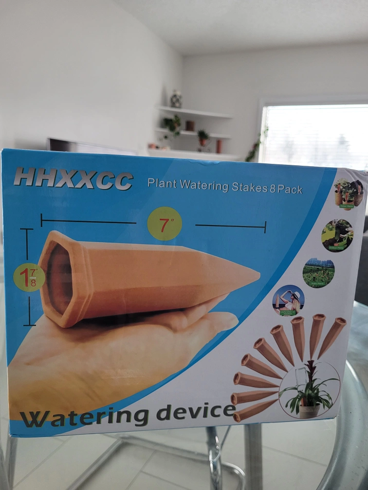 Terracotta watering stakes, unused, still in the box. Great solution for more consistent watering with less effort. They are also good for watering while on vacation.