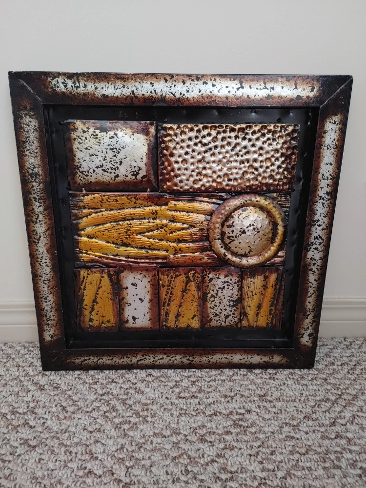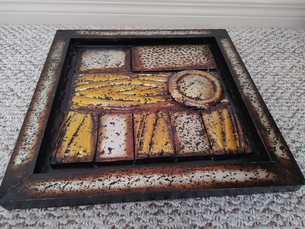 Metal wall art with a black frame. The artwork is made up of several metal pieces in varying textures and colours.