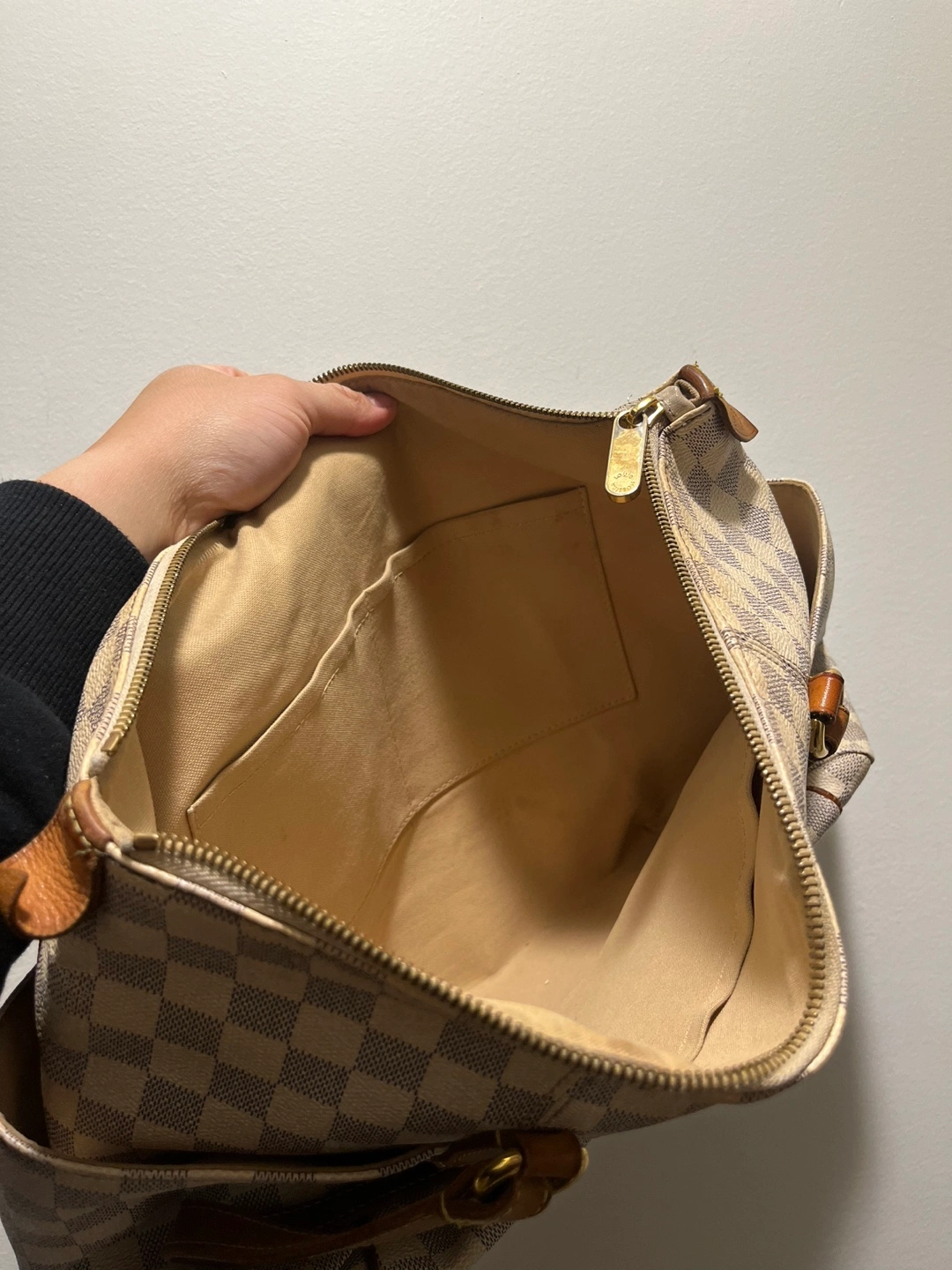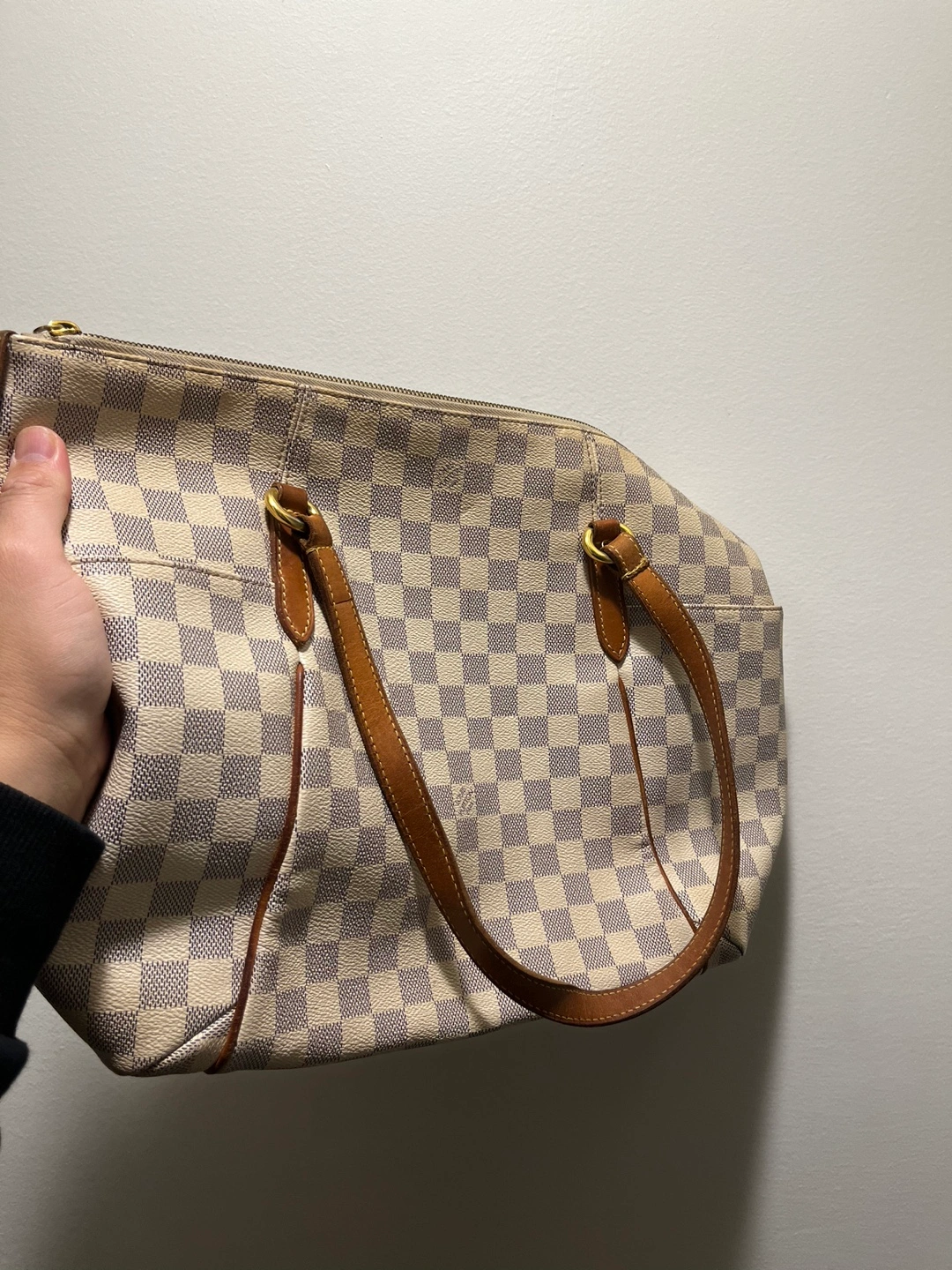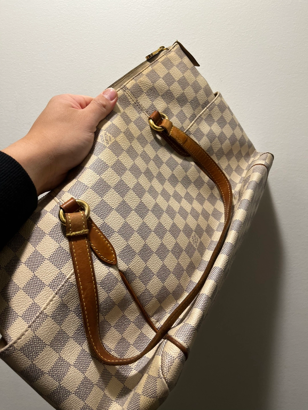 Authentic Louis Vuitton Damier Azur tote bag. Features a zipper closure, two top handles, and an interior pocket.