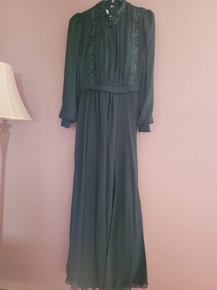 Long, green, formal dress with a high neckline and long sleeves. The dress features delicate embroidery and beading. Perfect for a special occasion.