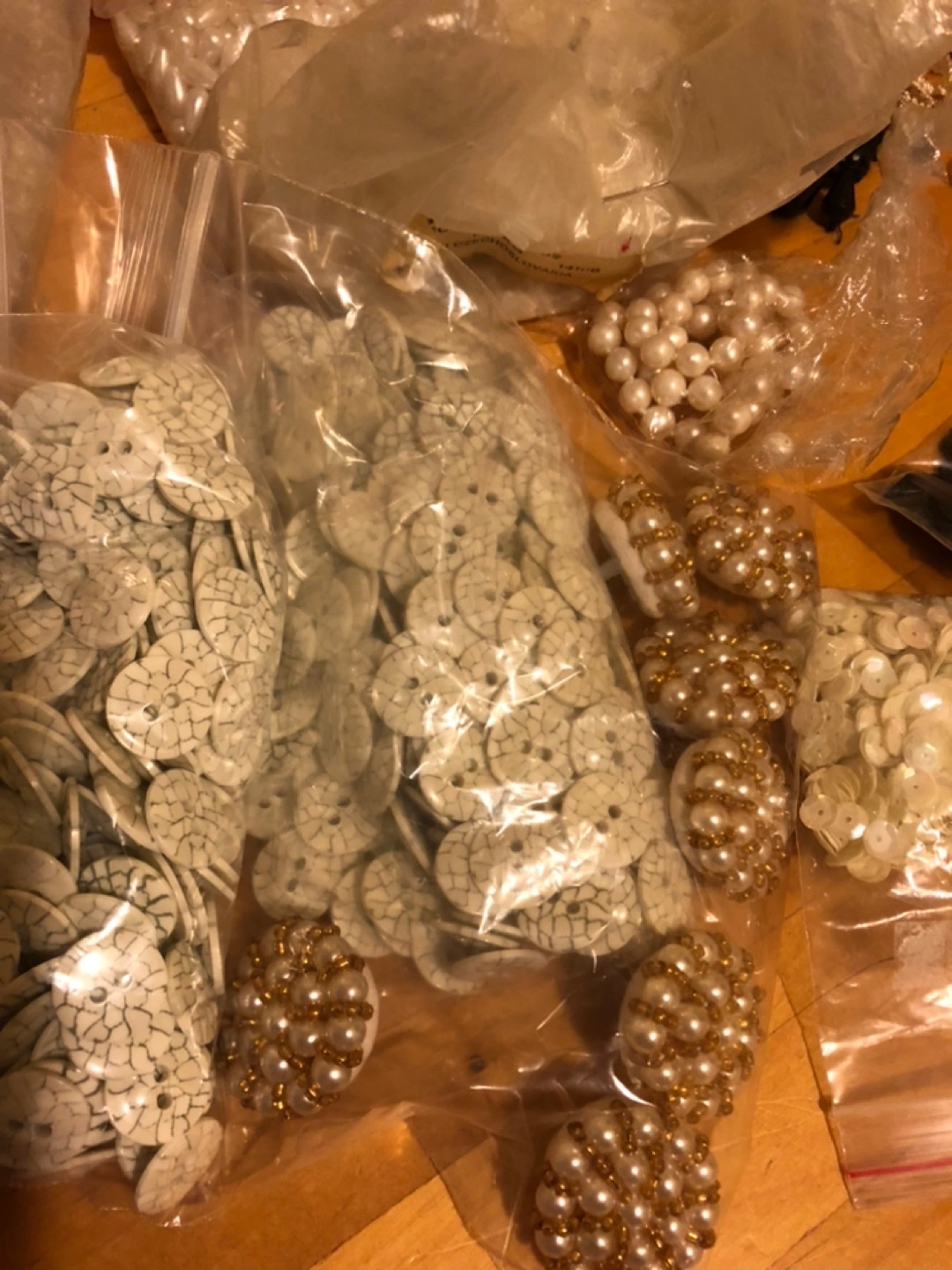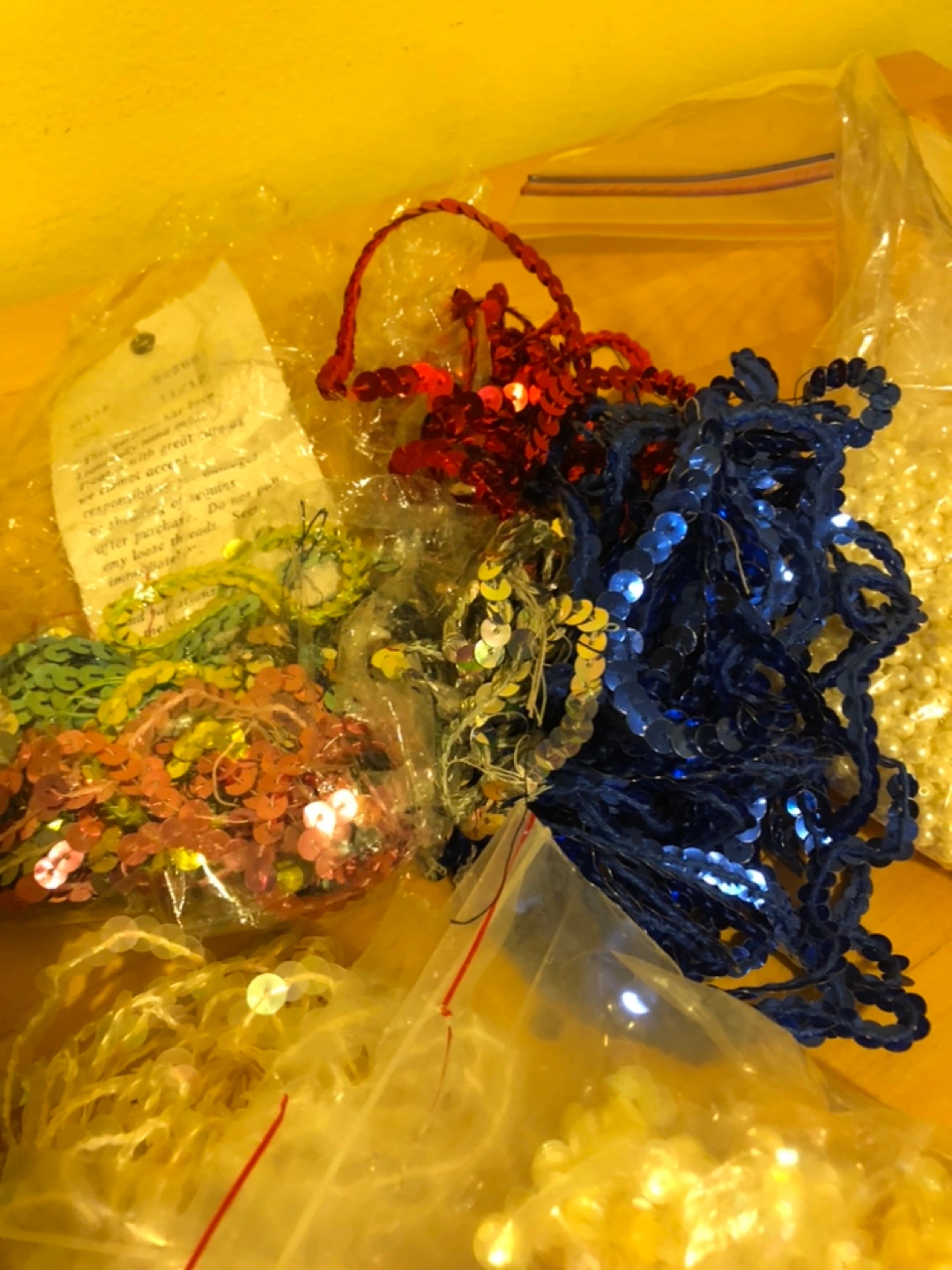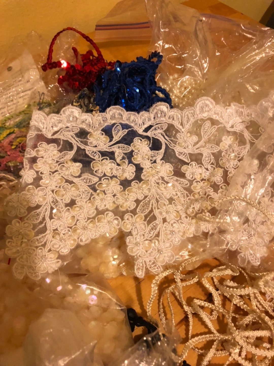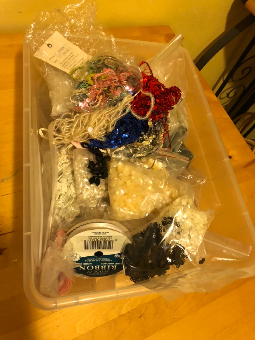 Assortment of sewing and craft supplies including buttons, beads, ribbon, lace, and sequins.