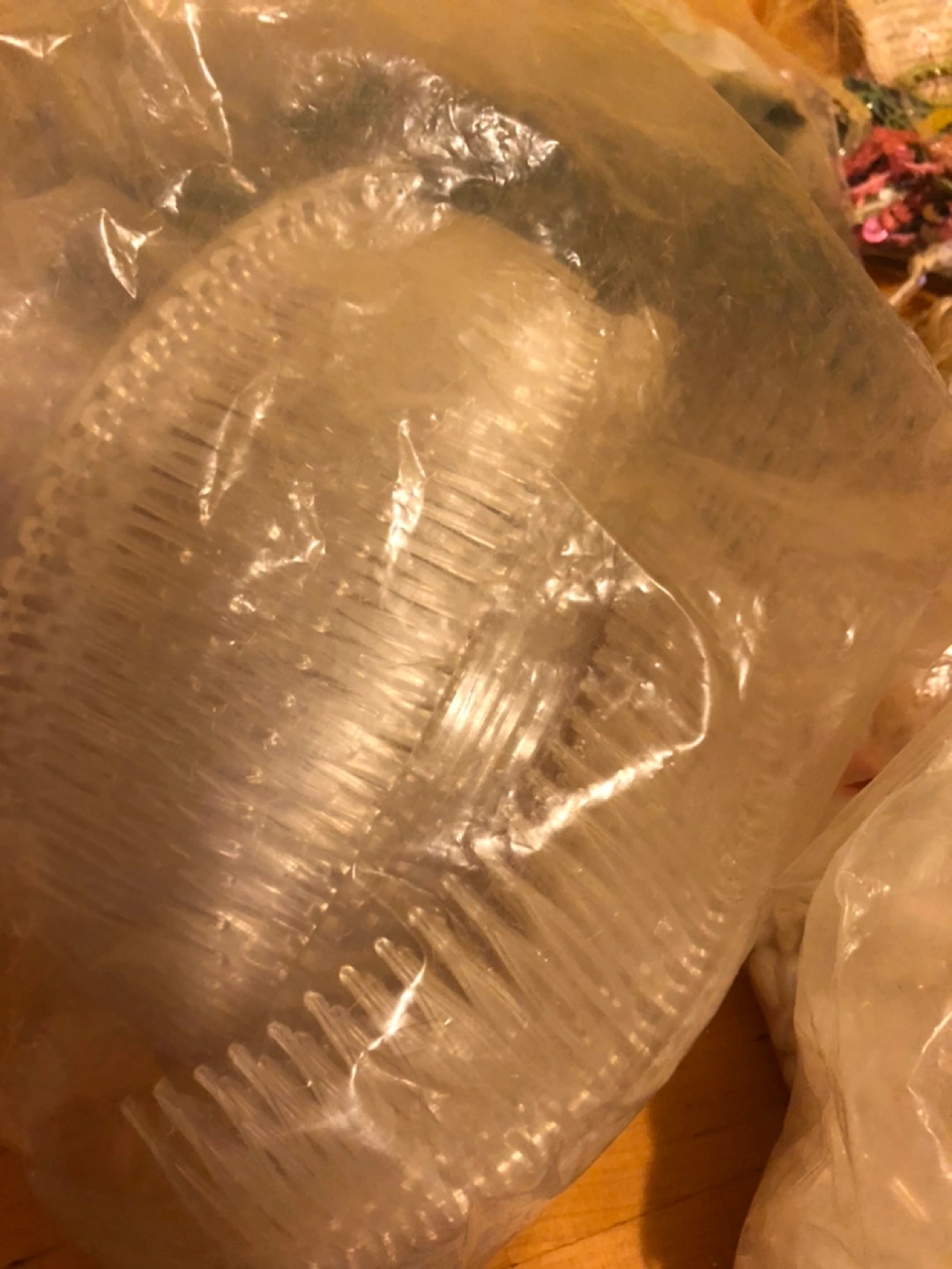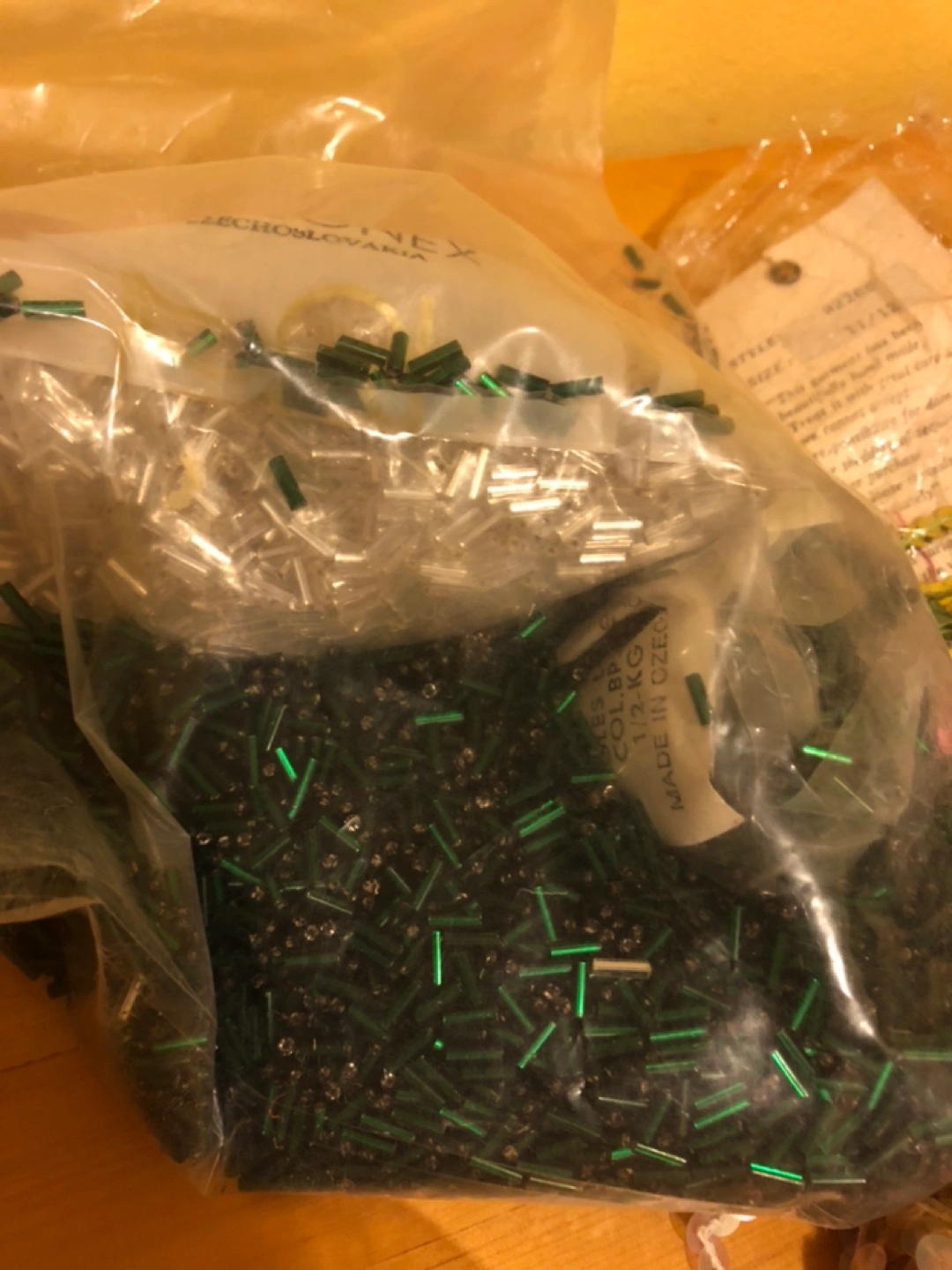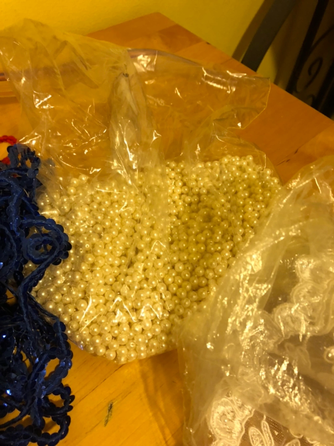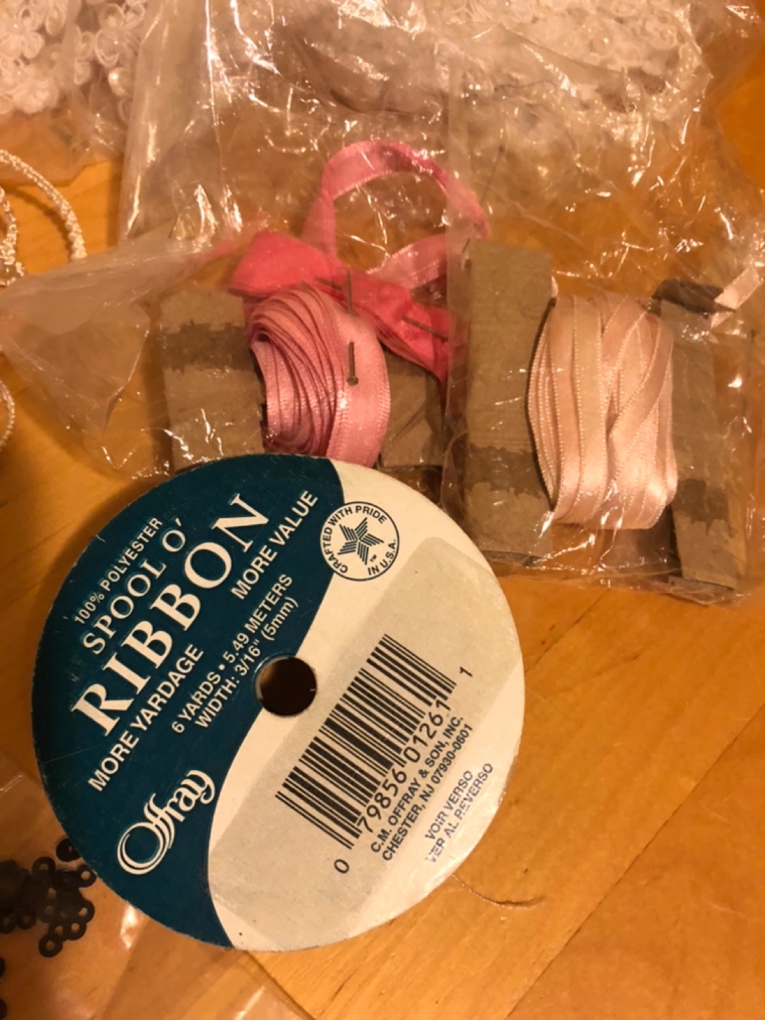 Assortment of sewing and craft supplies including buttons, beads, ribbon, lace, and sequins.