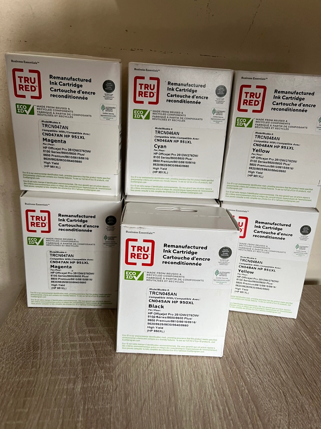 Set of 6 remanufactured ink cartridges, compatible with HP OfficeJet Pro 951XL printers. Includes black, cyan, magenta, and yellow cartridges.
