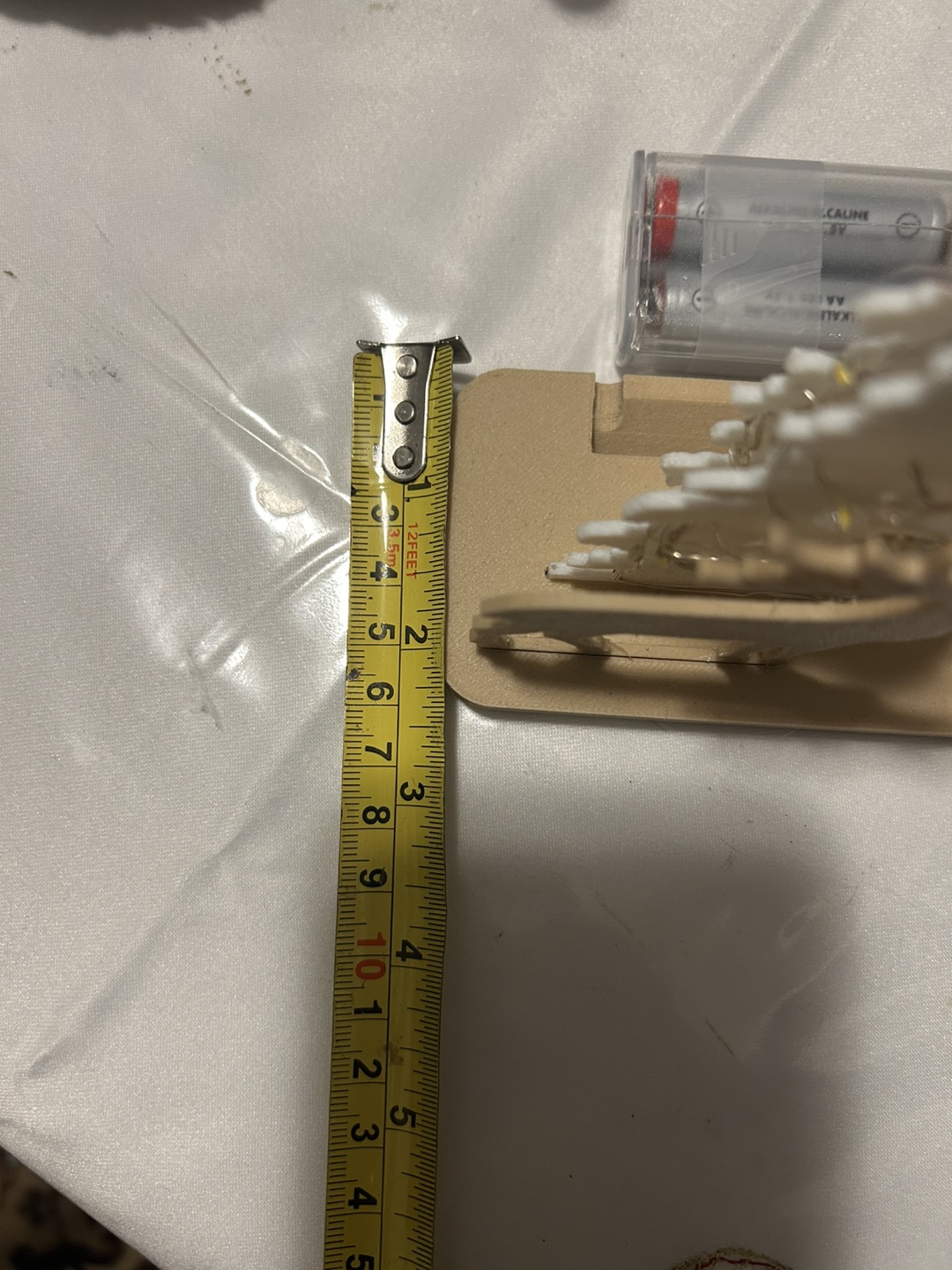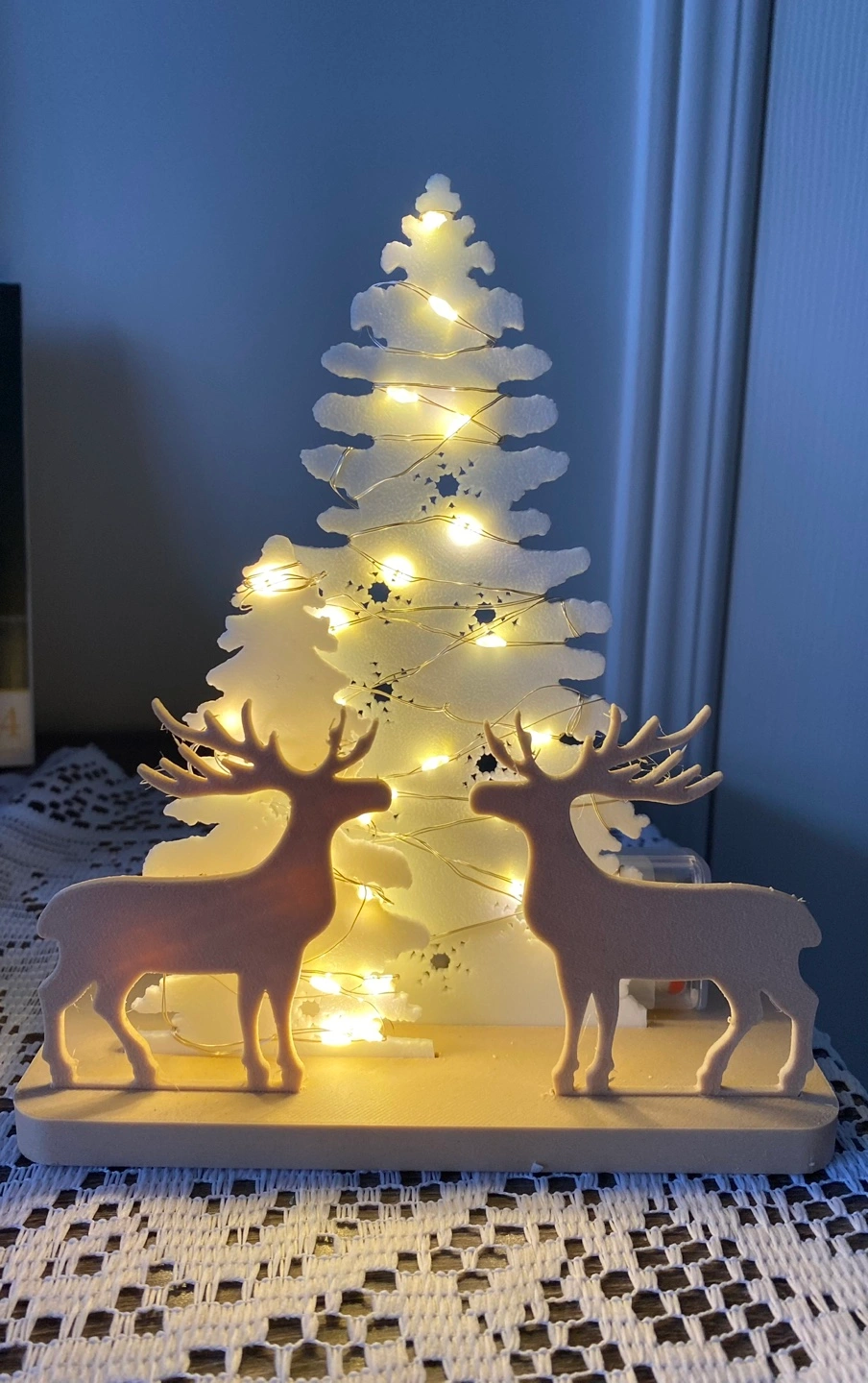Christmas decoration featuring two deer and a Christmas tree with lights. Requires two AA batteries (not included). Stores flat